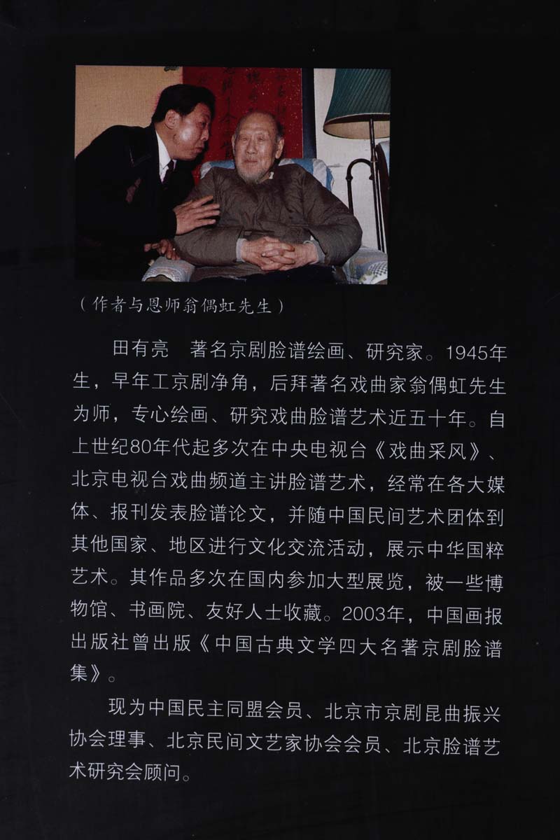 田有亮,男,京劇淨角。出生於1945年2月,農曆乙酉年。早年在專業劇團工淨行,後拜著名戲劇家翁偶虹先生為師,專心繪畫、研究戲曲臉譜藝術近四十年。