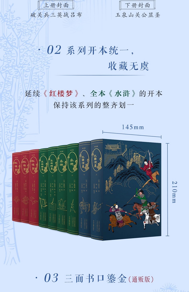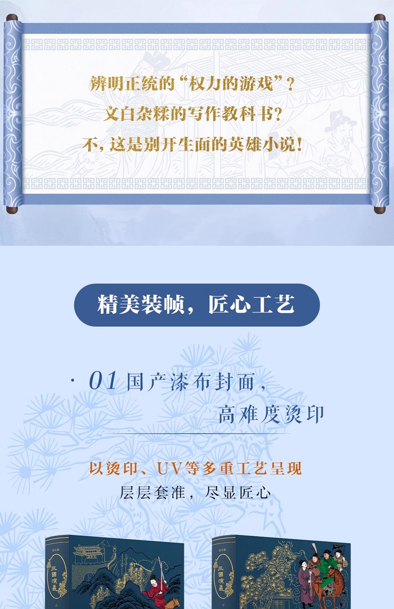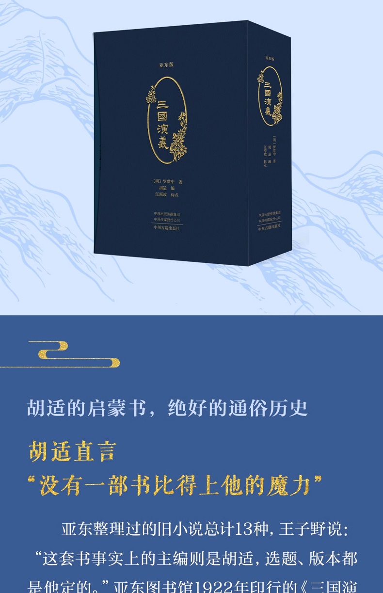 該書為古代文學作品。 《三國演義》是中國小說目前長篇回小說的開山之作,此版為民國時期上海亞東圖書館出版的「亞東版古典小說」系列叢書中的一種。該書描寫了從黃巾起義為始,到西晉三國統一為止,九十餘年中的重大歷史事件及歷史人物的活動,展現了魏、蜀、吳三國興亡的宏大歷史畫卷,形像地再現了這一風雲變幻的歷史時代,塑造了眾多形象鮮明的英雄人物。亞東版《三國演義》再版十一次,堪稱經典。該書是對亞東版《三國演義》的複刻與致敬,不僅保留原版風貌,還另加古典繡像若干,皆為古代名家作品,古雅而不失趣味,在裝幀、版本、學術研究等多個層面皆具有研究和收藏價值。