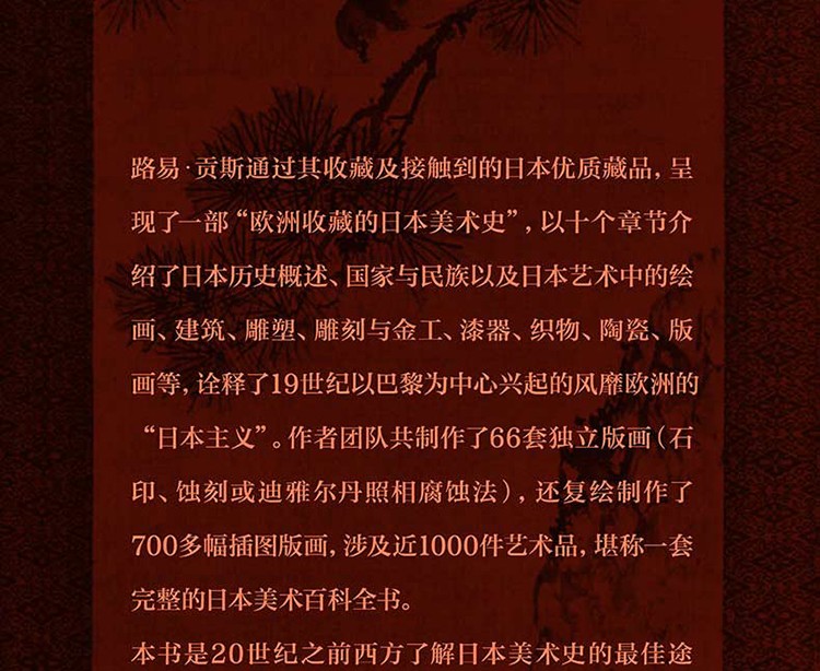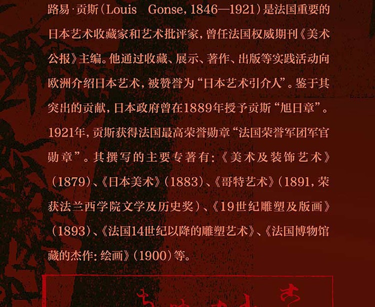 "1.一部“歐洲收藏的日本美術史”,世界範圍內第一部日本美術通史著作20世紀之前西方了解日本美術史的最佳途徑。法文版曾五次再版,1891年、1893 年英文 版和日文版相繼問世,本書在研究日本藝術領域具有先驅性貢獻。2. 法文原版(全兩卷) 首次以中文出版本書以1883年法文首版譯出。譯者增加大量註釋。3 . 19 世紀有名法國藝術評論家、收藏家的經典著作作者貢斯被授予法國優選榮譽勳章“法國榮譽軍團軍官勳章”和日本“旭日勳章”,數十年來蒐集文獻史料,與其所收藏的日本藝術藏品一 一比等