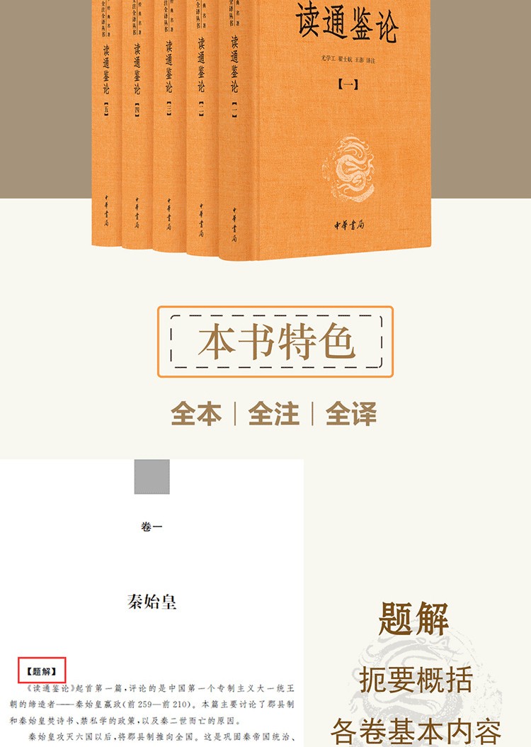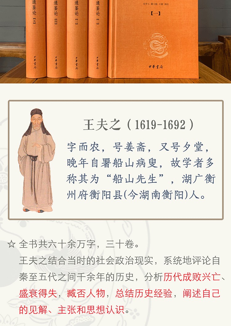《讀通鑑論》是明末清初著名思想家、史學家王夫之的一部史論名著,以司馬光《資治通鑑》所載史實為據,系統地評論自秦至五代的封建社會歷史,分析歷代成敗興亡,盛衰得失,臧否人物,引古鑑今,探求歷史發展進化規律。全書議論縱橫,新見迭出,堪稱傳統史論中最系統最精彩的傑作,同時全面反映了王夫之的歷史觀和政治思想傾向。