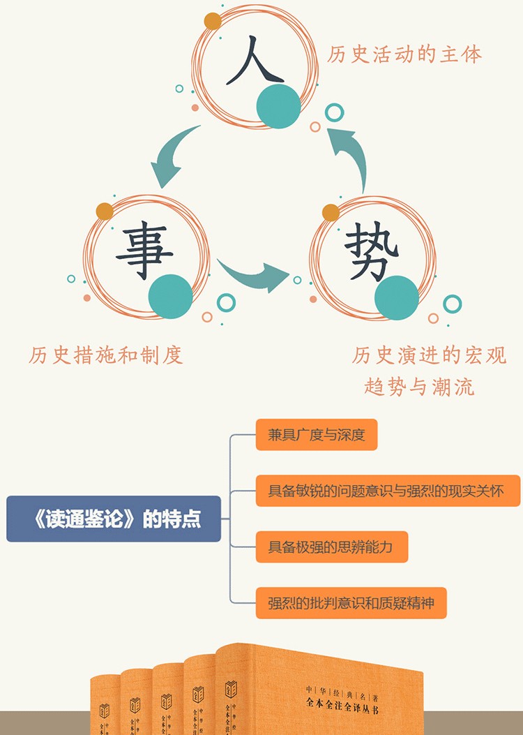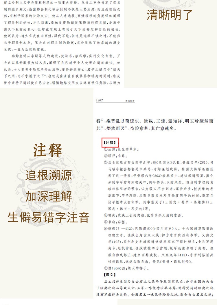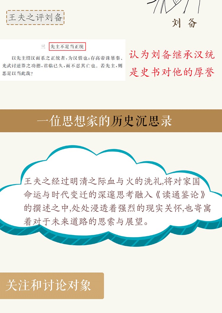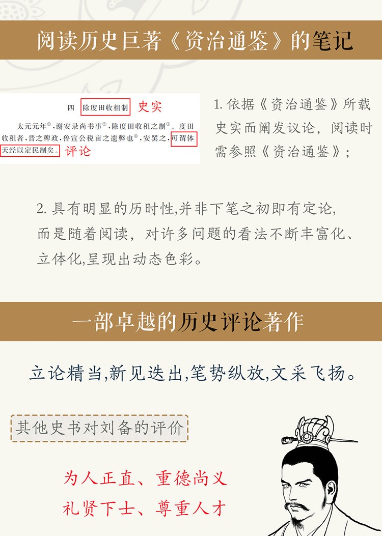 《讀通鑑論》是明末清初著名思想家、史學家王夫之閱讀《資治通鑑》感想和評論的筆記。全書議論縱橫,分析歷代成敗得失,臧否人物,借古鑑今,探求歷史發展規律,是我國歷史上最有影響、最精彩的史論專著。作者新見迭出,見解深刻,如他對劉備的評價:“以先主紹漢而係之正統者,為漢惜也;存高帝誅暴秦、光武討逆莽之功德,君臨已久,而不忍其亡也。若先主,則惡足以當此哉?”(認為劉備延續了漢朝而將他當做正統來看待的人,實際上是為漢朝感到惋惜;人們心中保存著漢高祖消滅暴秦、光武帝討伐篡逆的王莽的功德,認為漢朝統治天下已經很久了,而不忍心讓漢朝滅亡。至於劉備,他又哪裡足以當得起承繼正統的重任呢?)對“李廣難封”的評價:“東出而迷道,廣之為將,概可知矣。廣死之日,寧使天下為廣流涕,而弗使天下為漢之社稷、百萬之生靈痛哭焉,不已愈乎!廣之為將,弟子壯往之氣也。'輿屍'之凶,武帝戒之久矣。”(李廣在率軍走東路出擊匈奴的過程中迷失道路,他統兵作戰的能力由此可見一斑。李廣自刎而死的那天,寧可使天下人為李廣痛哭,而不可以使天下人為漢朝的江山社稷和數百萬生靈而痛苦,不也更好嗎?李廣做將領,憑藉的是初生牛犢不怕虎的氣勢。“戰敗後以車載運屍體而還”的後果,漢武帝已戒備很久了。)曾國藩評價:“先生皆已發之於前,與後賢若合符契。”對於豐富後人的歷史知識、提高歷史認識有著重要作用。