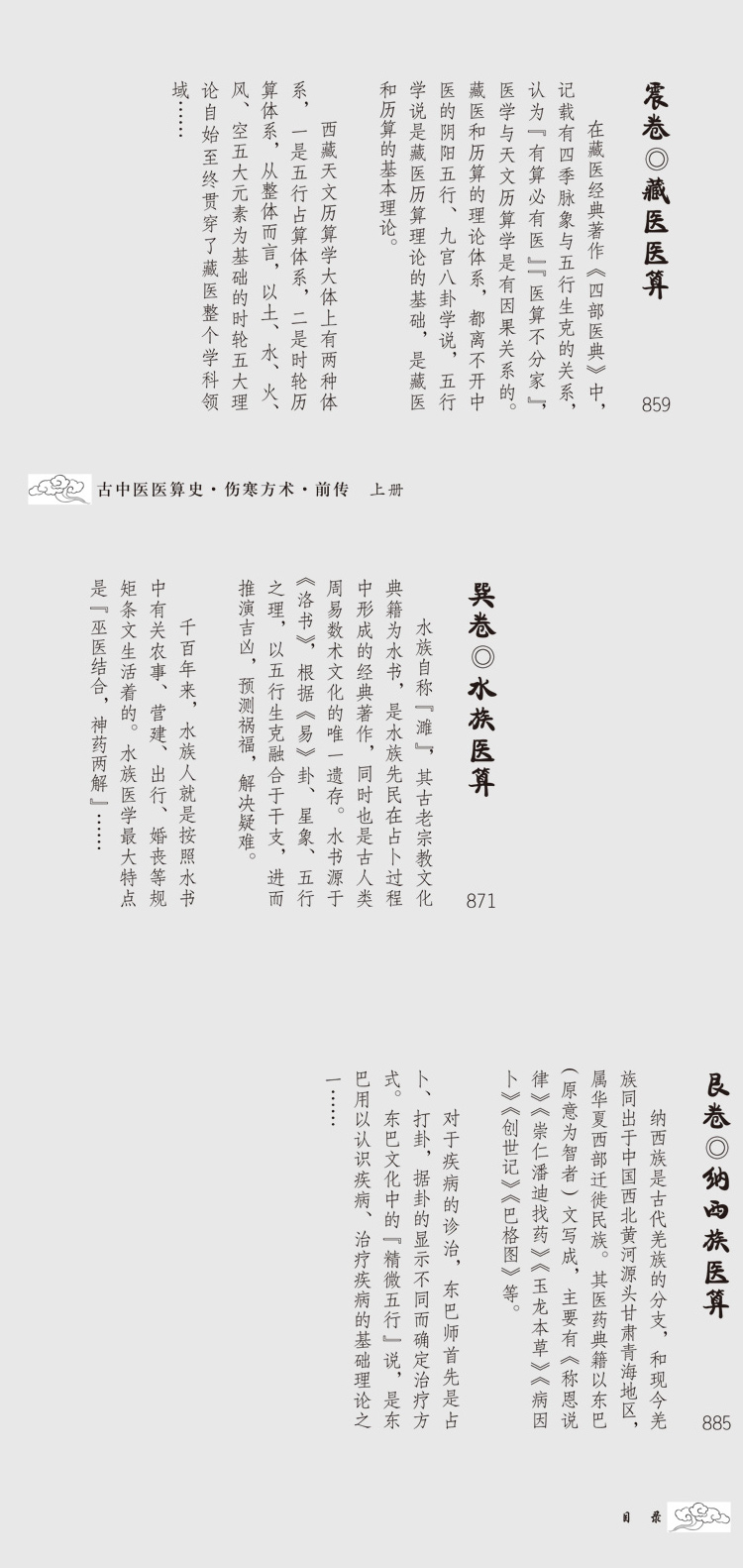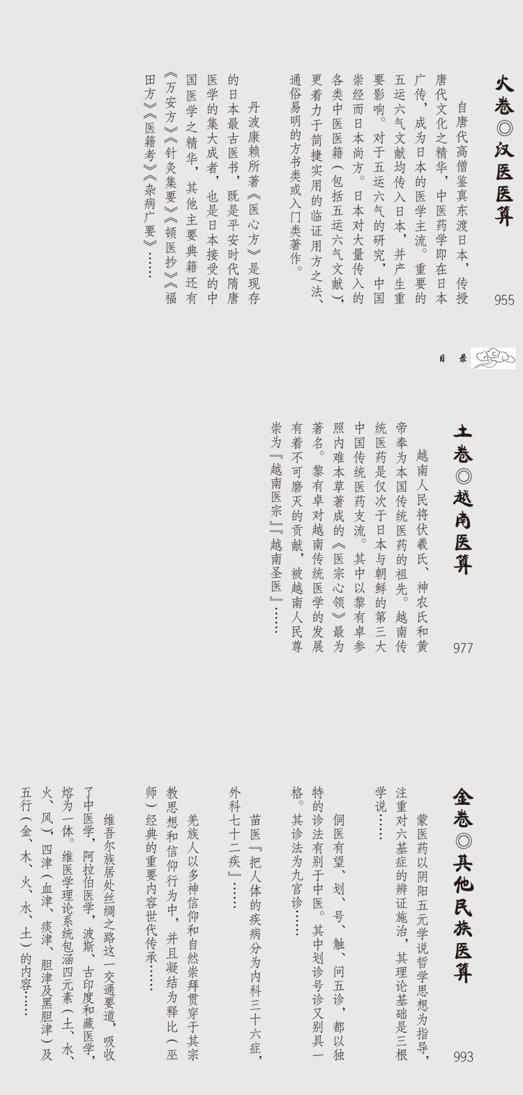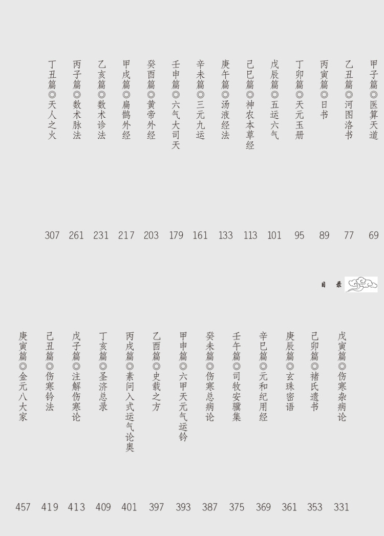 此書目錄僅分卷篇兩級,以八卦五行、北斗干支分列,乾坤兩卷開路,述中醫源流;《坎卷》厚重,其中分篇皆以乾支命名,為全書數術之重心;《離卷》及以後部分列述少數民族及外國醫算,異曲同工,權作參考。
