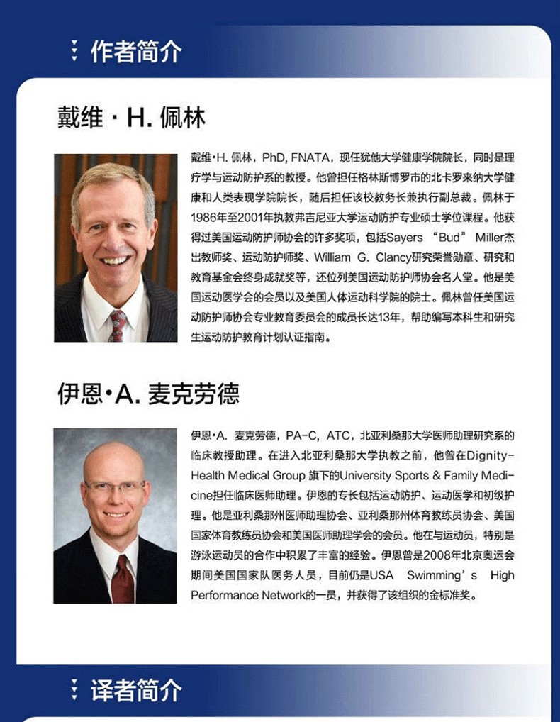 戴維·H.佩林博士,認證運動防護師(ATC),美國運動防護師協會會員(FNATA),現任格林斯博羅市的北卡羅來納大學的教務長兼執行副總裁,以前曾擔任過該校的健康與人類表現學院院長。在格斯博羅市任職前,佩林曾於1986 年zhi2001年指導運動防護教育計畫。他曾獲美國運動防護師協會(NATA)的許多獎項,包括Sayers“Bud”Miller傑出教師獎、zui著ming的運動防護師獎、William G. Clancy傑出運動防護師研究獎牌,併位列NATA 名人堂。他是美國運動醫學會的會士以及美國人體運動學和身體教育科學院的院士。佩林曾擔任NATA專業教育委員會的成員長達13年,協助撰寫本科生和畢業生運動訓練教育計畫認證指南。 2011 年,佩林被選為NATA 的會士。他於1996 年zhi2004 年擔任《運動防護》雜誌的主編,並曾擔任《運動康復》雜誌的創刊編輯。他是Isokinetic Exercise and Assessment和《運動貼紮與包紮(第3版)》的作者,The Injured Athlete的第3 版的編輯,以及Research Methods in Athletic Training的共同作者。