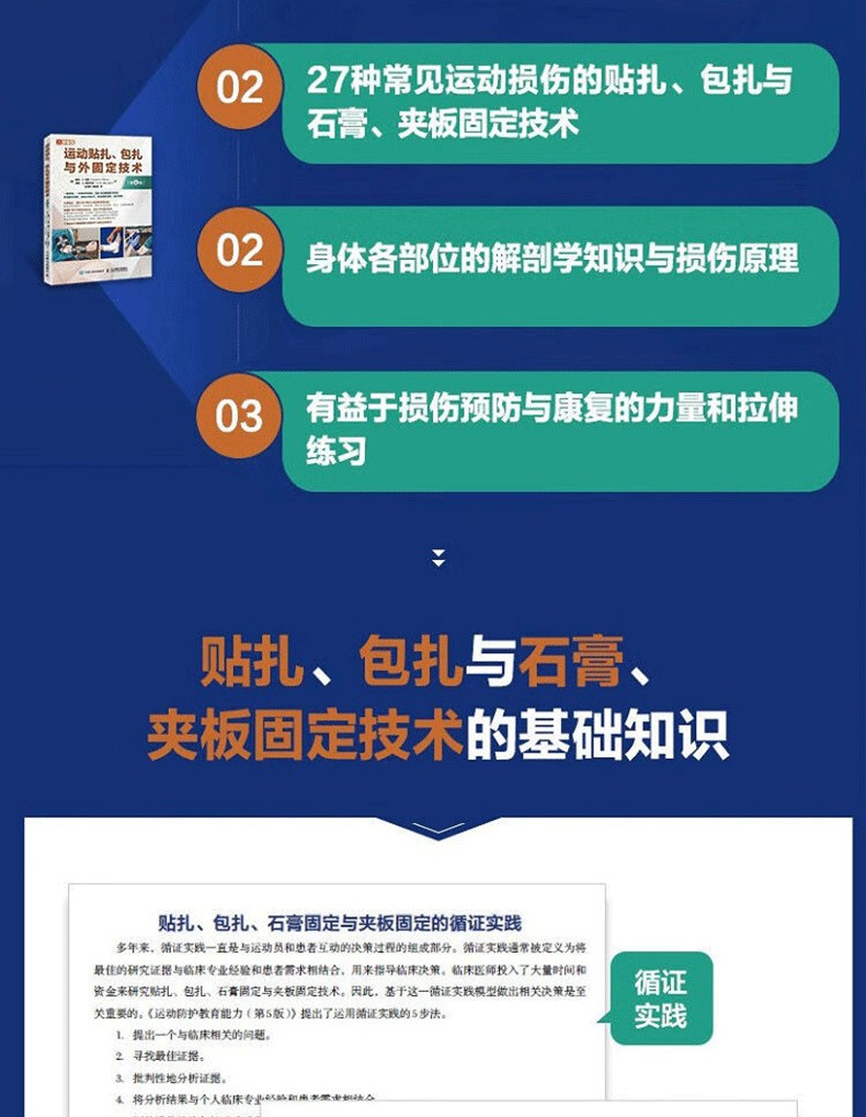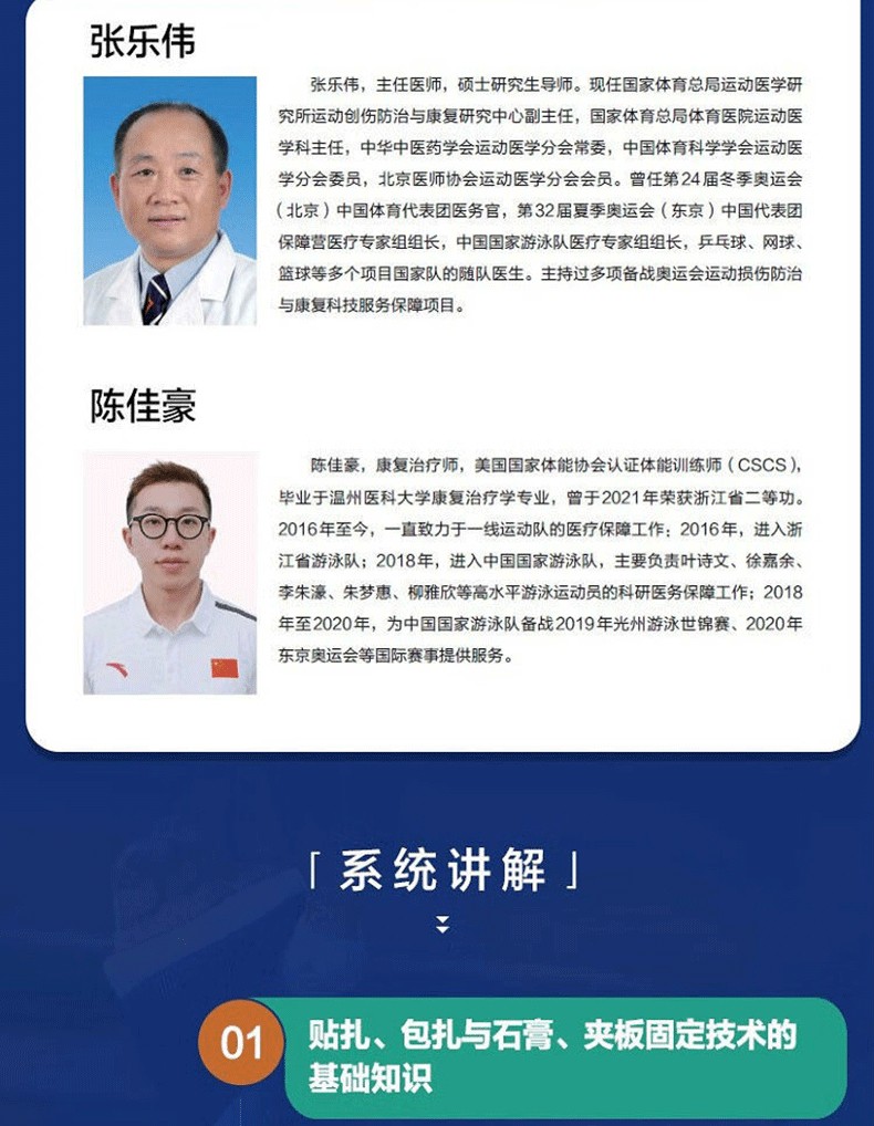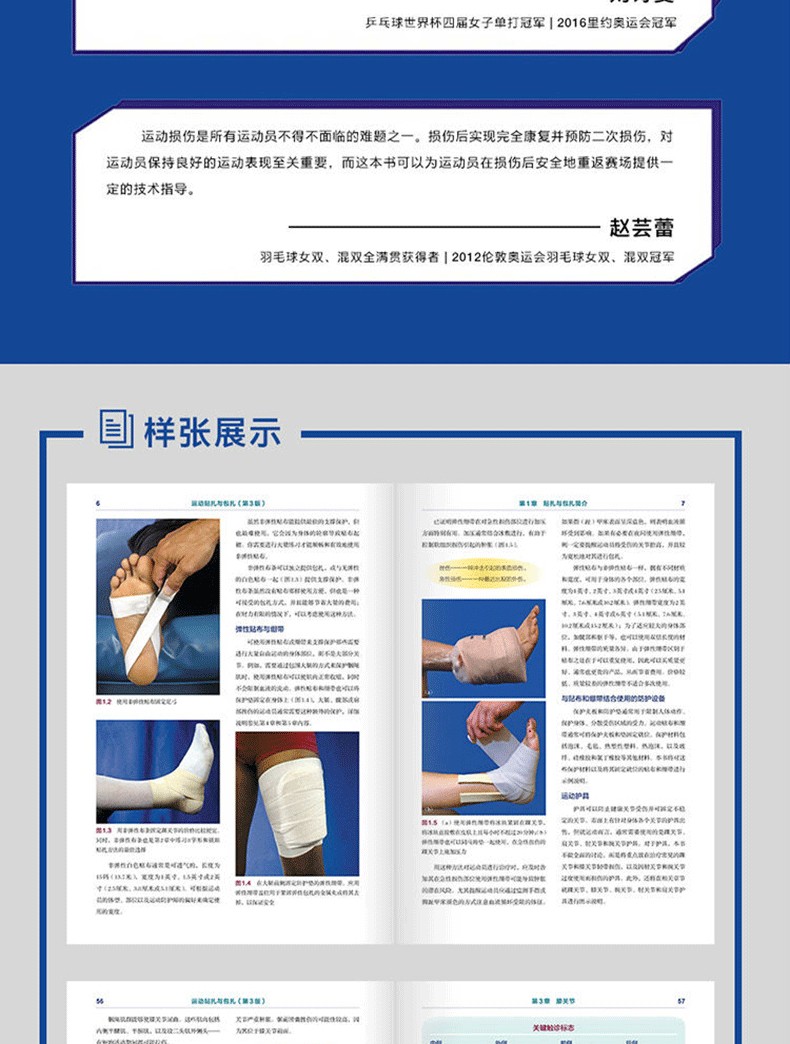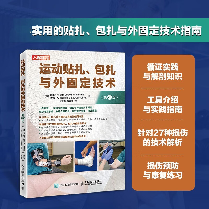 運動貼紮概述了貼紮、包紮與石膏、夾板固定技術的基礎知識,包括解剖學知識、循證實踐、作用、所使用的材料和準備工作等;然後通過專業示範圖片和分步驟文字講解,介紹了足部、踝關節、小腿、膝關節、大腿、髖部、骨盆、肩部、上臂、肘關節、前臂、腕關節與手部等主要身體部位的常見運動損傷的貼紮、包紮與石膏、夾板固定技術,以及各部位的解剖結構、損傷原理及有益恢復的伸展、肌力訓練等內容。本書旨在幫助教練、物理治療師、隊醫等掌握和應用正確的貼紮、包紮與石膏、夾板固定技術,並以此協助運動員進行傷後恢復及避免損傷再次發生。