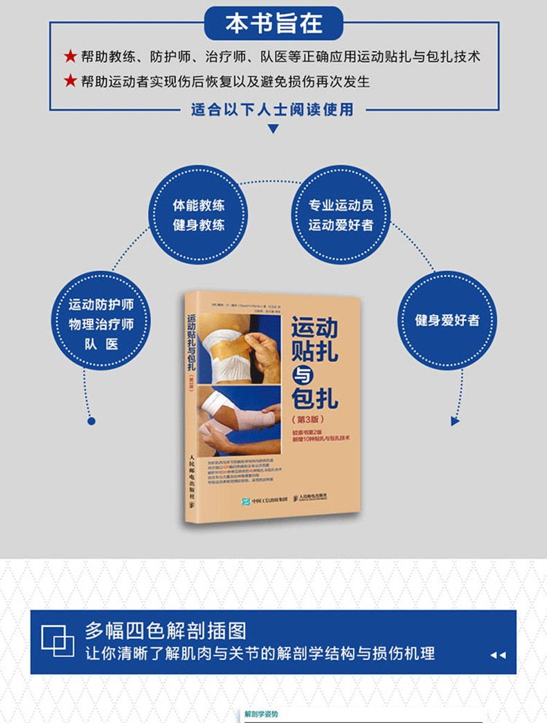 本書首先介紹了貼紮與包紮的解剖學基礎、角色和準備工作等內容。接著結合超過420幅真人示範照片,對足部、踝關節、小腿、膝關節、大腿、髖部、骨盆、肩部、上臂、肘關節、前臂、腕關節和手部的25種常見運動傷害的貼紮與包紮技術進行了分步講解。此外,本書介紹了針對各種損傷的肌力及伸展訓練,旨在幫助教練、防護師、治療師、隊醫等正確應用運動貼紮與包紮技術,幫助運動者實現傷後恢復以及避免傷害再次發生。