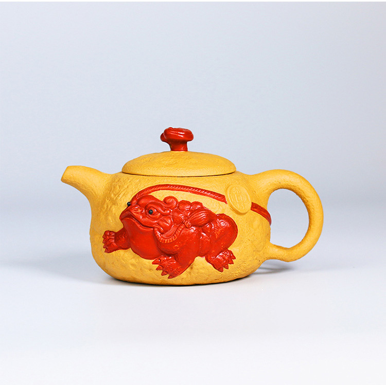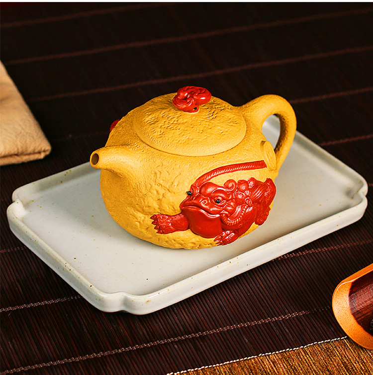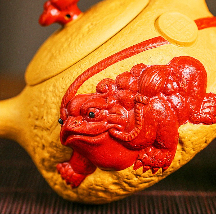 【宜興紫砂】原礦高黑泥描金 臥龍祥雲貔貅壺(260cc)破損免費補寄