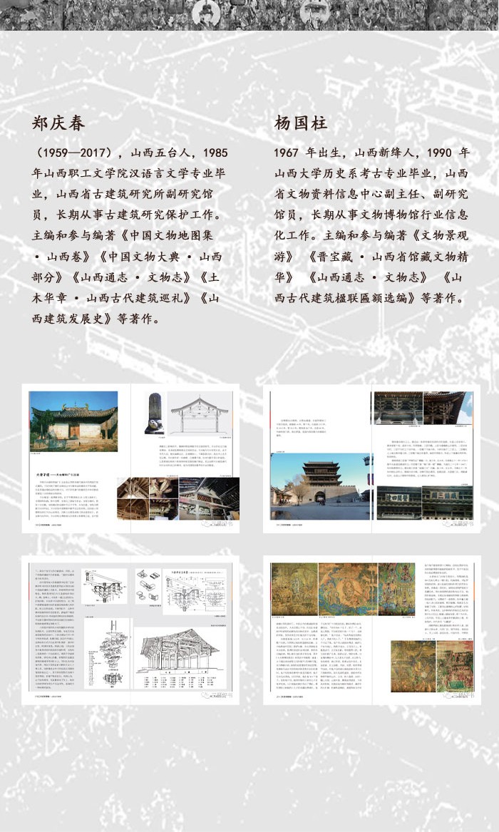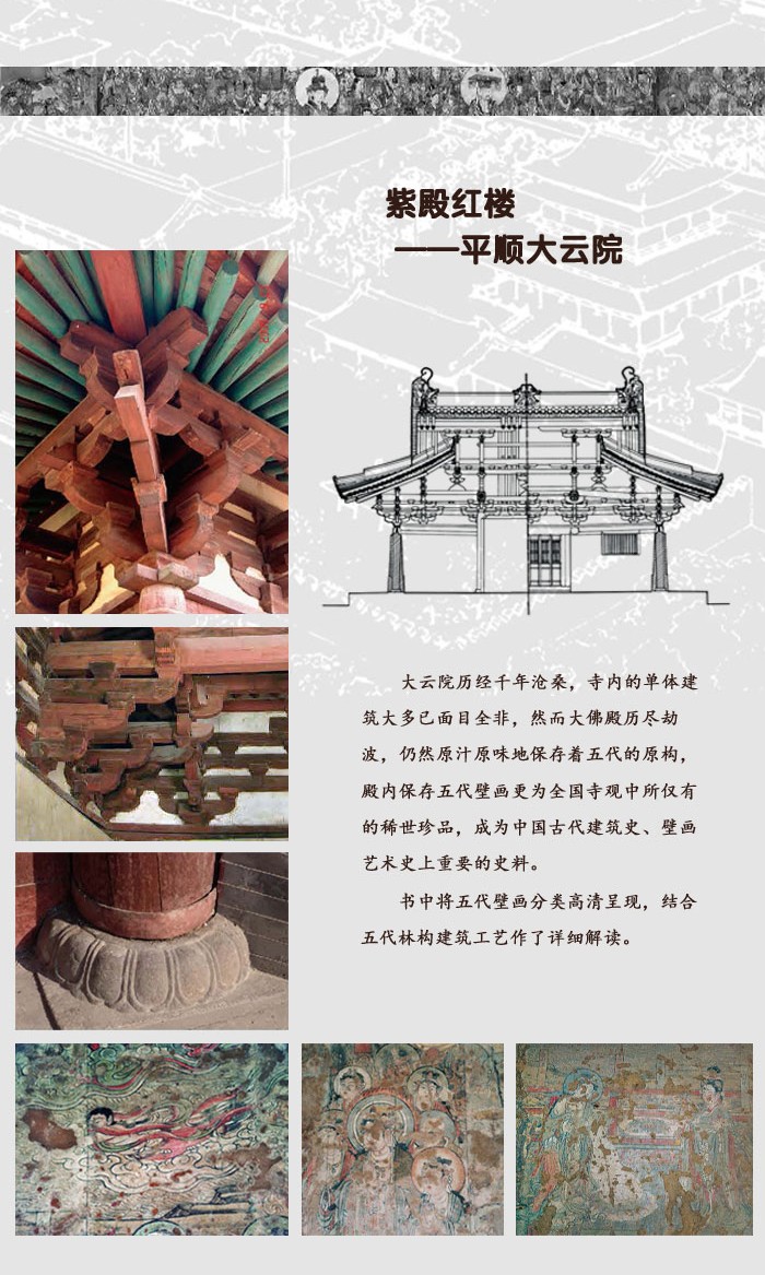 該書對山西古建築的發展脈絡進行了深入細緻的闡述。 猶如展開一幅幅古建的「歷史的捲軸」:大唐遺珍——亂世佛音——西京夢華——走向世俗——法雨禪風——承前啟後——落日餘暉。 讓讀者清楚看到各朝各代山西各地古建築的建造年代、特色、風格等。 展現了山西古建築的高超技藝與成就。