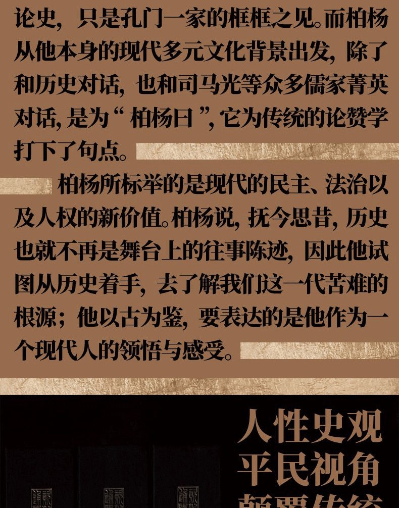 柏楊所標舉的,是現代的民主、法治以及的新價值。 透過本書862則“柏楊曰”,柏楊試圖和歷史對話,和司馬光對話,也和眾多的儒家精英對話;他試圖從歷史著手,去了解封建時代中國人苦難的根源;他以古為 鑑,要表達的是他身為現代人的領悟與感受。 本書處處可見柏楊「不為君王唱讚歌,只為蒼生說人話」的史觀,從「以人為本」的角度來審視歷史,為蒼生、為一個「人」的立場和尊嚴說「人」 話 。 傳奇的人生經歷,賦予了柏楊人格強烈的人文色彩,柏楊的人文精神,為讀者提供了一種具有顛覆意義的、閱讀歷史的新視角。