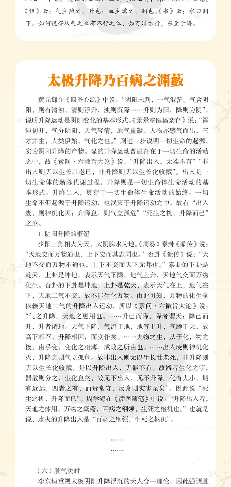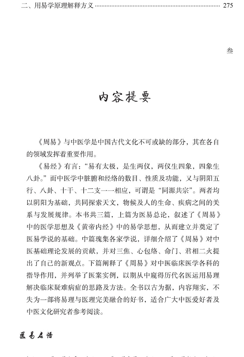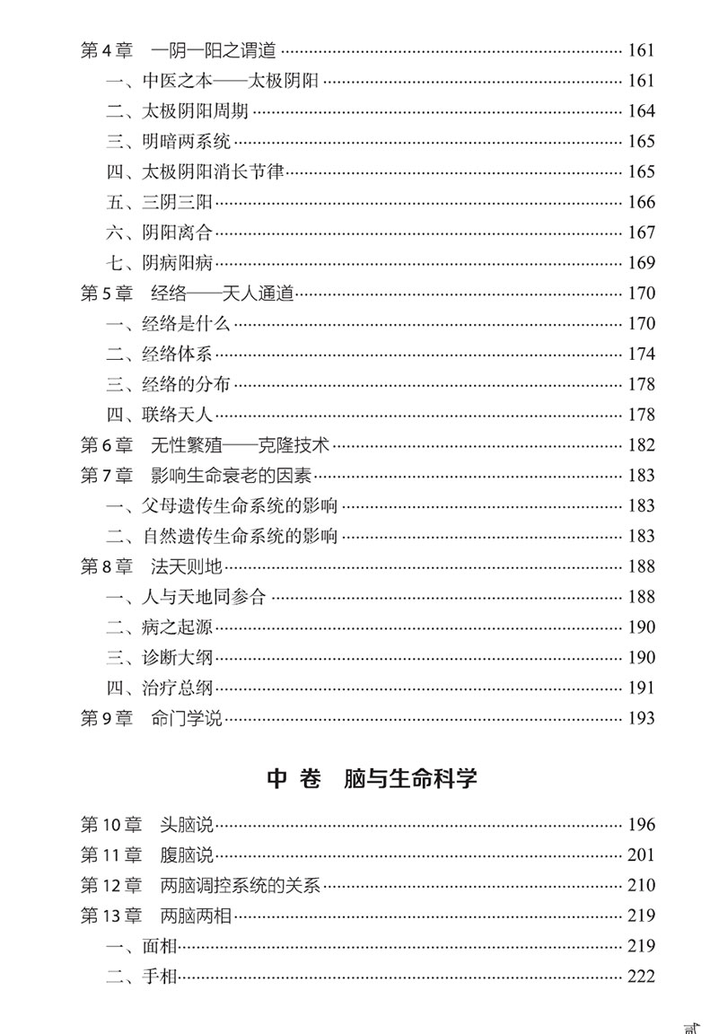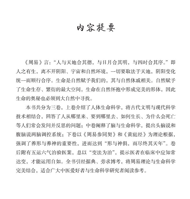 《周易》言:“人與天地合其德,與日月合其明,與四時合其序。”即人之有生,離不開陰陽、宇宙和自然環境,一切要取法於天地,陰陽變化統一而順行合序。生命是自然賦予我們的,其與自然休戚相關。自然賦予了生命生存、繁衍的優選空間,生命在自然懷抱中形成完美的形體,因此生命的奧秘也必須到大自然中尋找。本書共分為三卷,上卷介紹了人體生命科學,將古代文明與現代科學技術相結合,回答了人從哪裡來、要到哪裡去、如何生長、為什麼會死亡等人們常會發問並反思的問題;中卷闡釋了腦與生命科學,提出頭腦說和腹腦說兩腦調控系統;下卷以《周易參同契》和《黃庭經》為理論根據,強調了養形與養神的重要性,進而達到“形與神俱,而盡終其天年”。卷後附有五運六氣治驗醫案,總以“變法為治”,提示醫者在臨床中應知常達變,才能運用自如。全書引經據典、旁求博考,將周易理論與生命科學完美結合,適合廣大中醫愛好者與生命科學研究者閱讀參考。