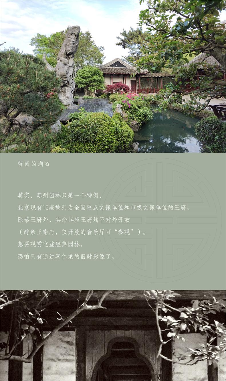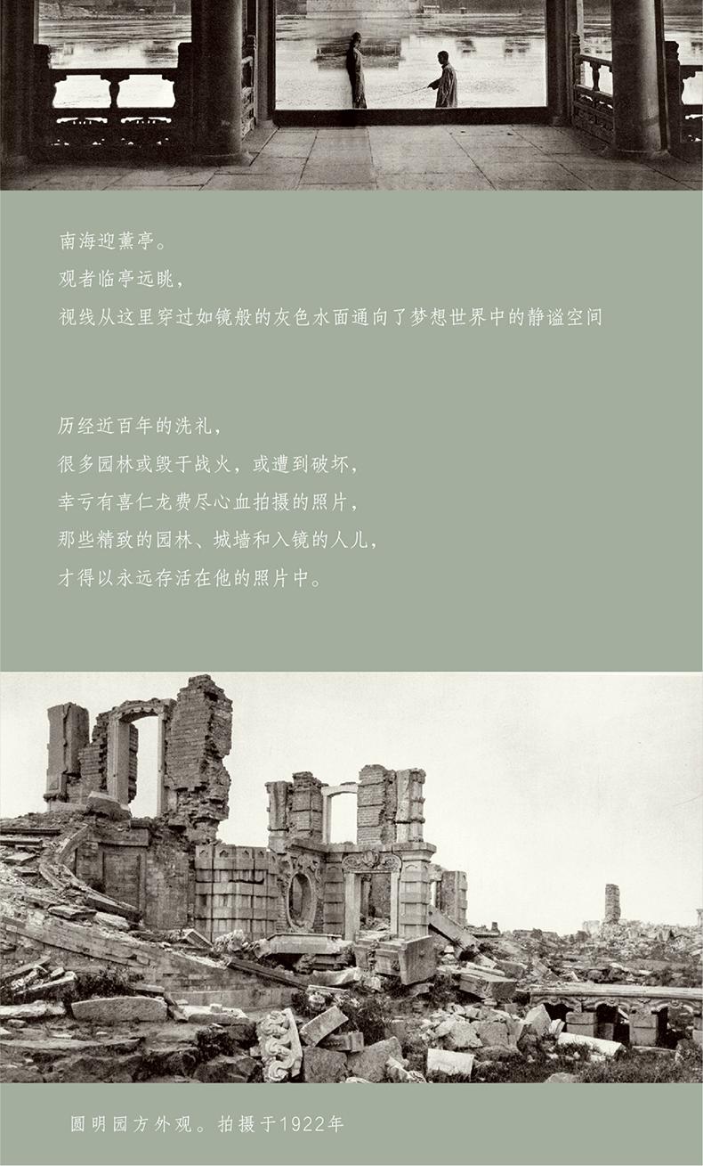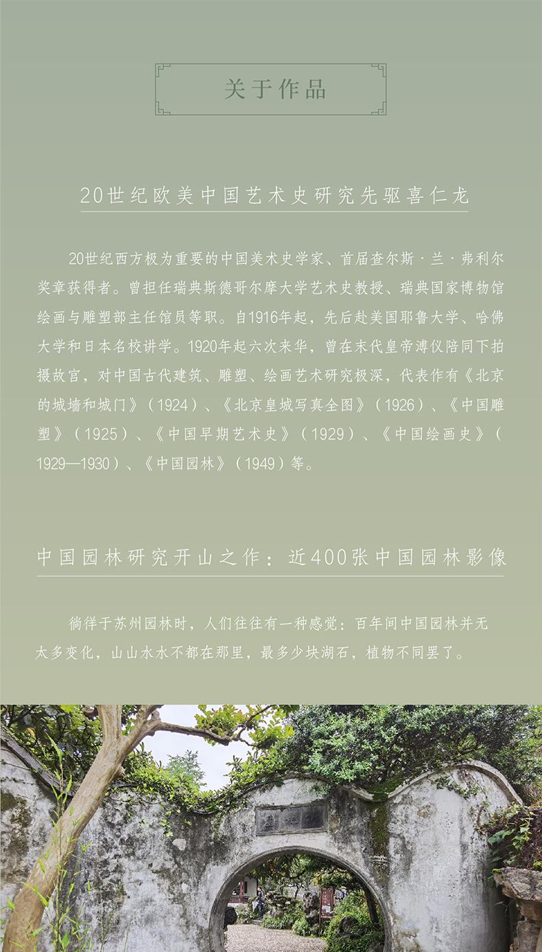 《中國園林》初版於1949年,共收錄圖片近400幅,系統論述中國園林的藝術特點和發展流變,是世界公認的中國園林研究開山之作。 1921年,喜仁龍得到中華民國總統的特許,成為少數幾個獲准進入民國政府辦公地中南海、北海、頤和園等地進行考察和攝影的外國學者之一。其後,遍訪拍攝蘇杭等地私家園林,並獲得弗利爾美術館等海內外館藏機構支持,拍攝大量中國園林的名畫。這些園林大部分或毀於戰火或遭人為破壞,幸虧有喜仁龍費盡心血拍攝的圖片,我們才得以從中一窺舊時風貌。附錄部分收集了醇親王奕府邸罕見照片60幅。