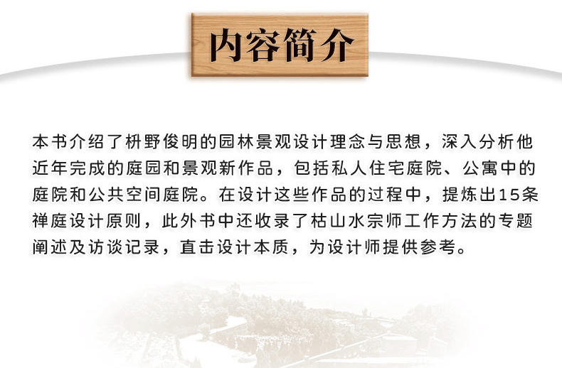 本書介紹了日本枯山水代表人物枡野俊明的園林景觀設計理念與思想,深入分析了枡野俊明自2012—2018年間,在5個國家完成的15個獨特的庭園和景觀作品,並從這些項目中 分別提煉出15個設計原則,配以實景和圖紙做了詳細的描述與記錄。 書中既有位於不同場合枯山水庭園實例的介紹,又有不同設計原則的歸納,還包括枡野俊明景觀設計工作方法的專題闡述及訪談記錄。