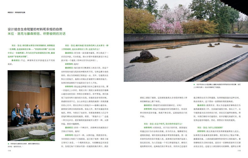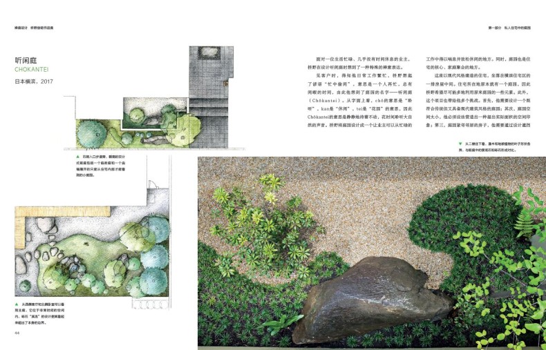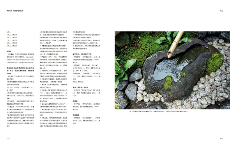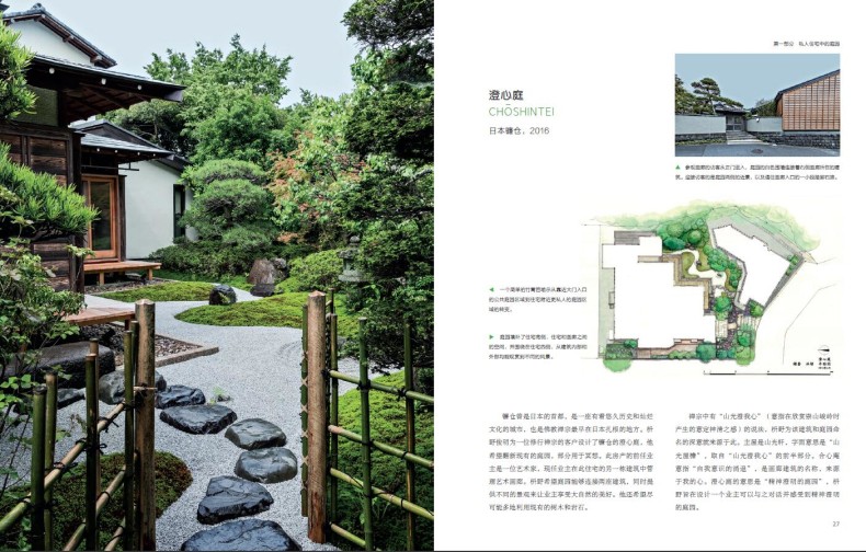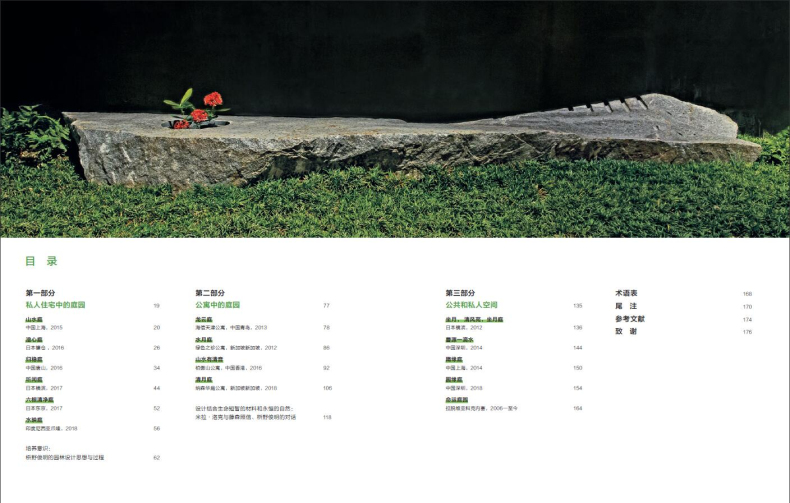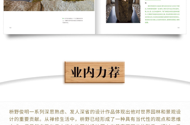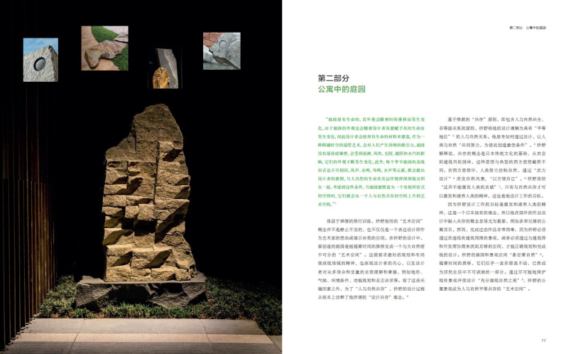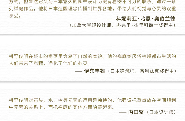枡野俊明先生是日本國寶級的枯山水大師,曾被美國《時代週刊》雜誌評選為當代值得尊敬的100位日本名人之一,現擔任日本造園設計事務所總設計師,多摩美術大學環境學科教授,曾在多個國家設計並完成多個優秀項目。作為日本當代景觀設計界最傑出的設計師之一,枡野俊明先生的作品繼承和展現了日本傳統園林藝術的精髓,準確地把握了日本傳統庭園的文脈。本書收錄了枡野俊明先生的全部庭院設計作品,其中包括日式傳統園林、日式現代園林、日本境外作品三大板塊,分別列舉了枡野俊明先生相對應的作品。本書主要採用大量精心拍攝的照片和設計圖片,來表現這些作品。每處園林作品配以各種細節照片,裝幀設計風格清新簡單。在本書中枡野先生這樣說到,“作為禪僧的我一直是遵循建立在禪的精神基礎上進行長年創作的,'作庭'對於我來說是把'自己'放在不同空間進行表現的一種精神性很高的設計過程。它不僅僅是追求造型美,而且,被稱為'石立僧'的禪僧們是把庭園作為'自己的表現'的場所,並把作庭過程視為每日修行的一部分。我自己也是一樣,把作品的創造過程視為修行,到現在為止,一點一點的積累起來。'庭'在我心中佔據了非常重要的地位”。這種特殊的哲學給人的印象十分的深刻。對於景觀設計師和日本園林的愛好者來說,這是一本不可錯過的好書。