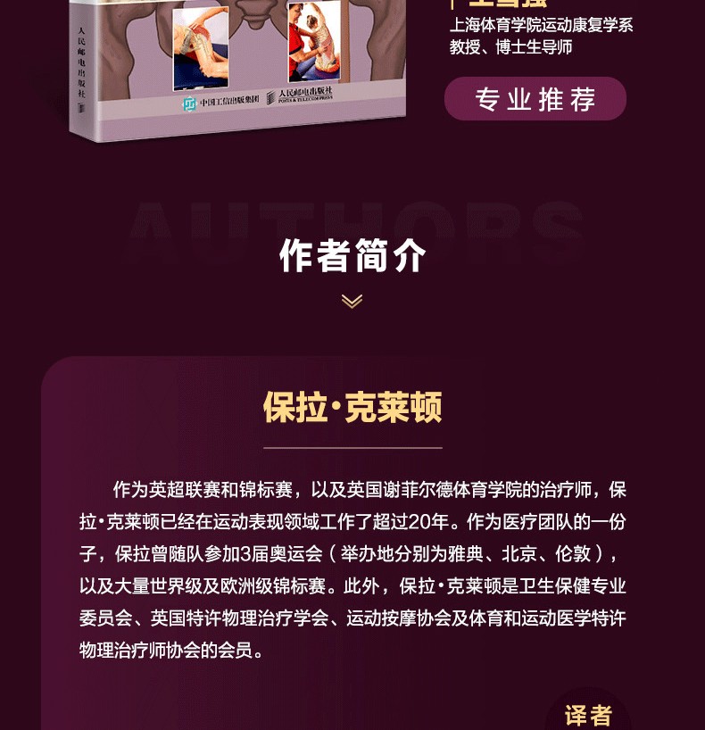 保拉·克萊頓 作為英超聯賽和錦標賽,以及英國謝菲爾德體育學院的高 級治 療師,保拉·克萊頓已經在運動表現領域工作了20多年。作為醫療團隊的一份子,保拉曾隨隊參加3屆奧運(舉辦地分別為雅典、北京、倫敦),以及大量世 界級及歐洲級錦標賽。她的經驗非常豐富,並且在寫作的所有圖書中分享了這些經驗。保拉·克萊頓是三家運動損傷診所的負責人及BMI醫院運動損傷科的高 級臨床物理治 療師,還是軟組織治 療師協會的運動表現總監及針對多學科聯合會診的運動損傷治 療協調員。此外,保拉·克萊頓是衛生保健專業委員會、英國特許物理治 療學會、運動按摩協會及體育和運動醫學特許物理治 療師協會的會員。譯者簡介 趙鵬 ......