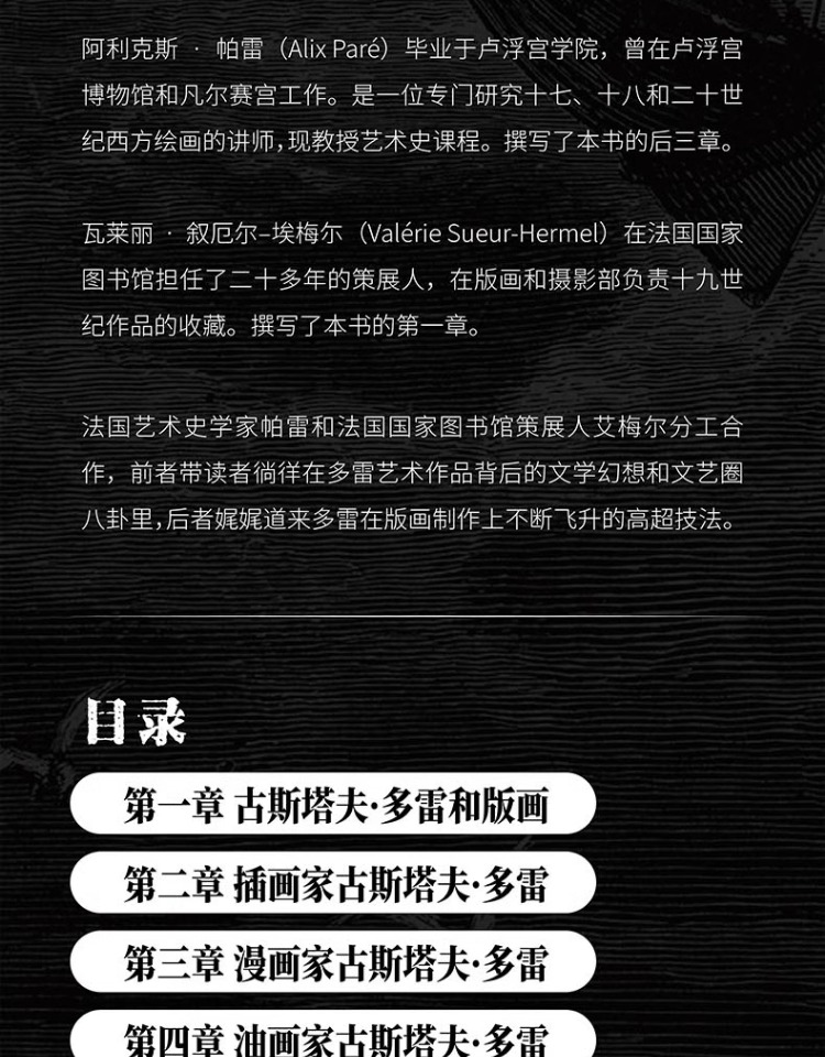 分別來自羅浮宮和法國國家圖書館的兩位法國編輯從多雷的上萬幅插圖作品中精選出那些極其重要、視覺效果甚是強烈、很能代表他藝術風格的作品,兩人分工合作,前者帶讀者徜徉在多雷藝術作品背後的文學幻想和文藝圈八卦裡,後者娓娓娓道來多雷藝術作品背後的文學幻想和文藝圈八卦裡,後者娓娓道來多雷版的高超技製作高超技。讀者會感覺自己站在連結古典和前衛的橋樑之上,一起沉浸在多雷的永恆魅力中吧!