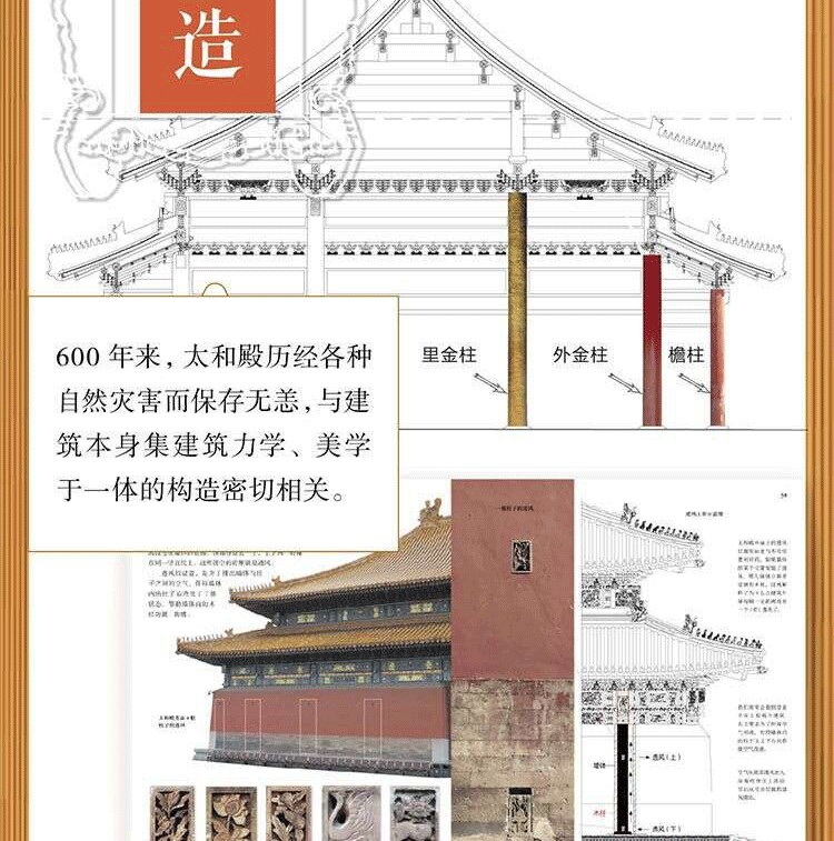 作者長期現場調查研究的基礎上,以深入淺出的語言、大量珍貴的圖片,對太和殿的基礎、柱架、榫卯節點、鬥拱、裝修、樑架、屋頂、牆體等建築構造,以及 太和殿的歷史、陳設、修繕保護等方面進行了較為全面的解讀,向讀者展示了太和殿豐富的歷史文化、精湛的建築技藝。