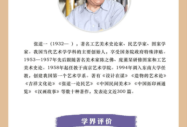張道一(1932— ),著名工藝美術史論家、民藝學家、圖案學家。 我國當代藝術學科的主要創始人,享有國務院政府特殊津貼。 1953—1957年先後跟隨著名美術家陳之佛、龐薰琹研修圖案與工藝美術史論。 1958年起任教於南京藝術學院。 1994年調到東南大學任教,創立我國第一個藝術系。 著有《設計在謀》《造物的藝術論》《吉祥文化論》《張道一論民藝》《中國民間美術》《中國拓印通覽》《漢畫故事》等數十種著作,發表 論文近300 篇。