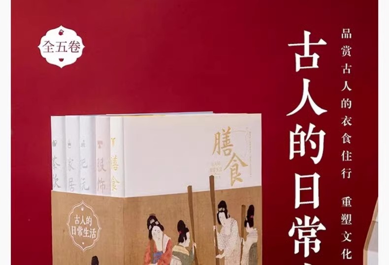 這套書就是《古人的日常生活》(全五冊),它包含「服飾」、「膳食」、「家居」、「茶飲」和「把玩」五個具體生活領域。 幾乎囊括了人們日常生活中基本衣食住娛的方方面面,如一套「古人日常生活百科全書」。 比起較為普遍的宏觀描述,這種貼近一般人視角的內容,更會讓人眼前一亮。