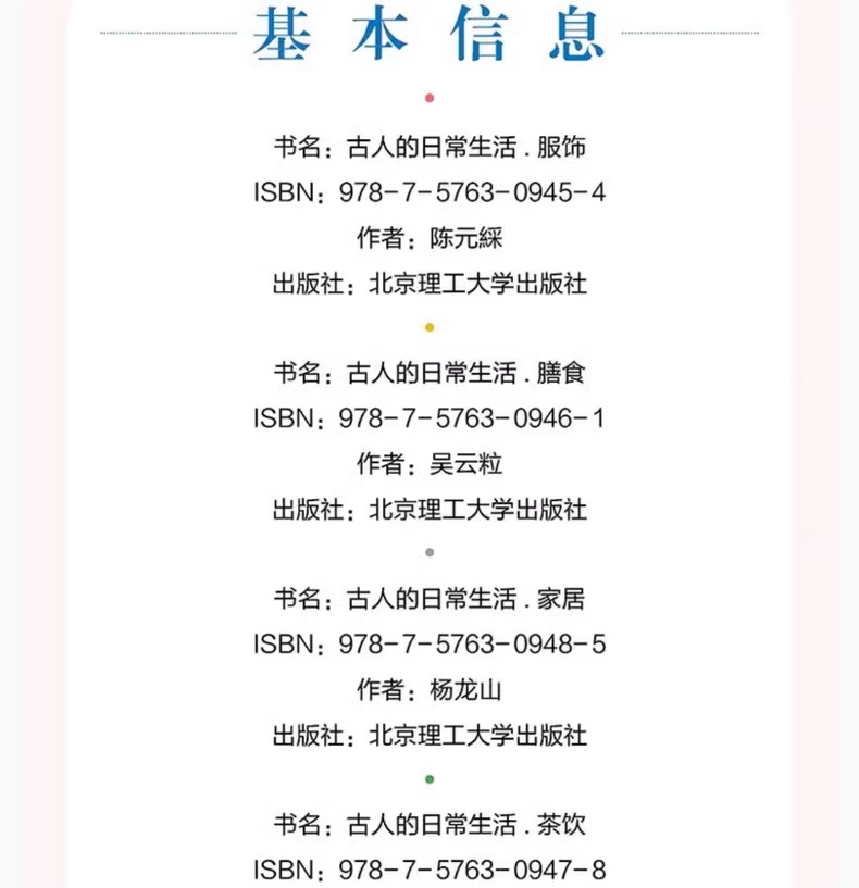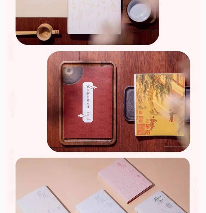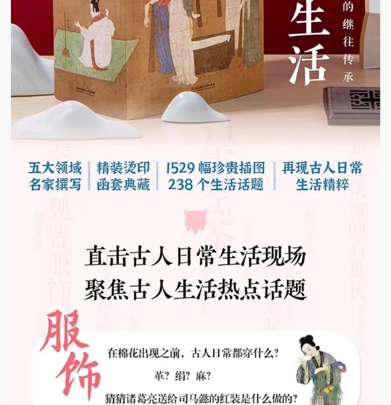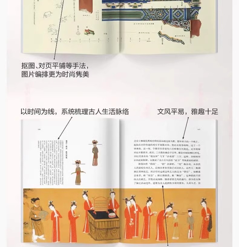 「古人的日常生活書系」在中國傳統文化「衣食住行」的基礎上,從古人精緻的把玩生活、古人服飾的精華與衍變、古人「意在物外」的茶飲藝術、古人家居建築美學、 古人日常膳食中選取了數百個與日常生活息息相關的話題,從言行舉止到鍋碗瓢盆,從園林宅居到收藏雅玩,有趣的文字搭配上千幅高清插圖,集實用與審美雙重功能 ,全方位展現古人日常生活的傳承與變遷。