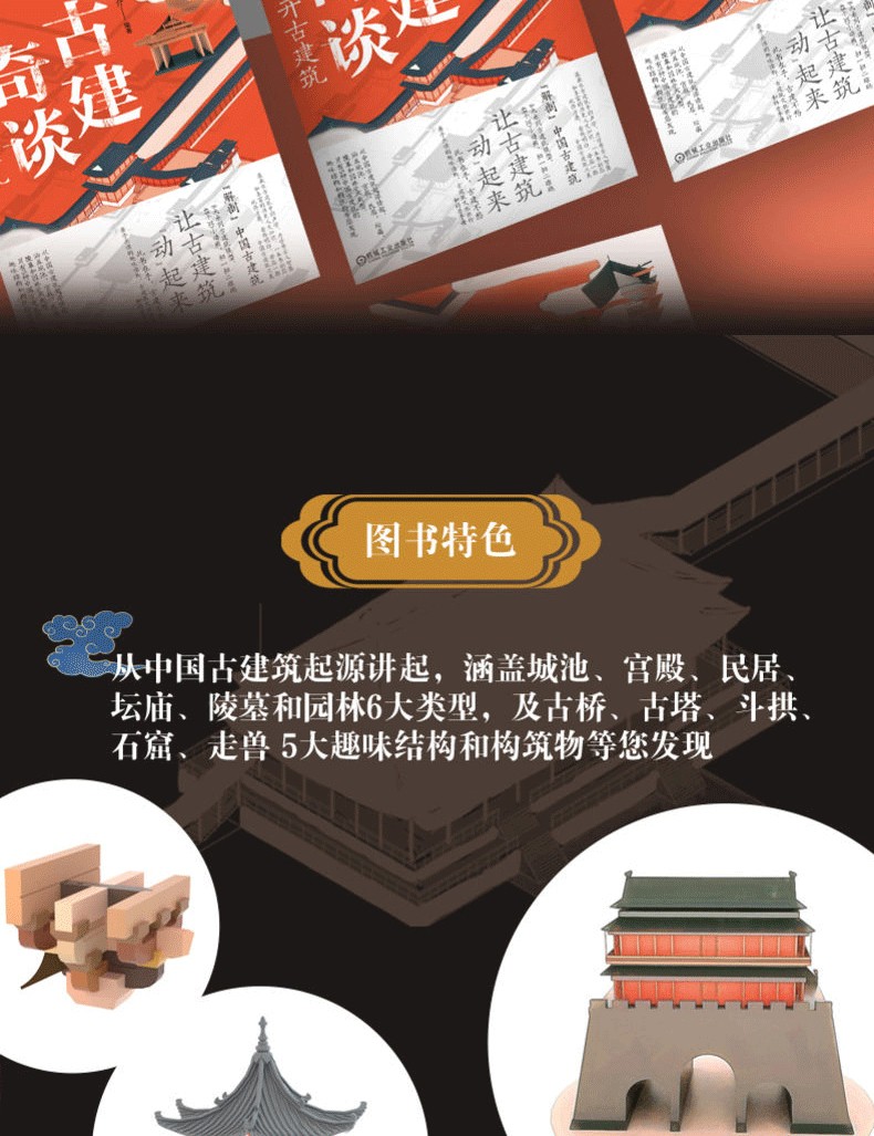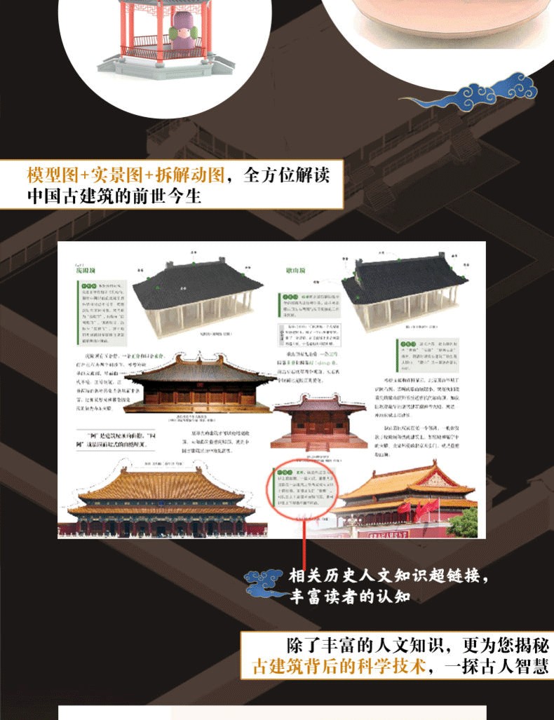 本書是一本中國古建築科普圖書,以活潑的語言使讀者可以快速了解中國古建築的發展。 透過「××是如何演變的」「如何欣賞一個××」「××有話」等問答方式,講解中國古建築的類型、歷史、文化、欣賞方式等。 同時結合二維碼動圖,將古建築一一拆解,讓中國古建築「活」起來。 全書共分8章,從中國古建築起源講起,涵蓋城池、宮殿、民居、壇廟、陵墓和園林6大類型,另有5種中國古建築的趣味結構和構築物等您發現。 淺顯易懂的圖解形式搭配拆解動圖,適合中國古建築愛好者以及喜歡中國傳統文化與遺產的大朋友小朋友閱讀。