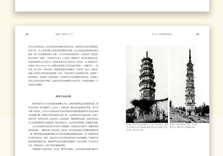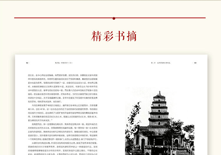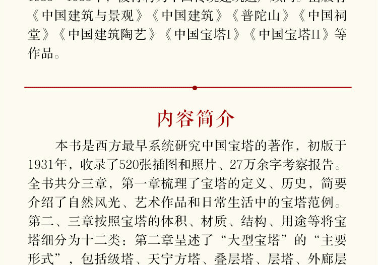 本書是西方 早期系統研究中國寶塔的著作,初版於1931年,收錄了520張插圖和照片、27萬餘字考察報告。 全書共分三章, 章整理了寶塔的定義、歷史,簡單介紹了自然風光、藝術作品和日常生活中的寶塔範例。 第二、三章依照寶塔的體積、材質、結構、用途等將寶塔細分為十二類:第二章呈現了“大型寶塔”的“主要形式”,包括級塔、天寧方塔、 疊層 塔、層塔、外廊層塔、琉璃塔、石塔、群塔;第三章討論的是寶塔的“演化形式”,包括鐵銅塔、墓塔、香塔、內塔。 經歷了近百年的變遷,書中的許多寶塔已經不復存在,使得《中國寶塔Ⅰ》成為後人 的里程碑。