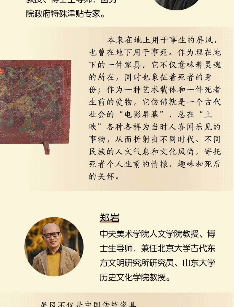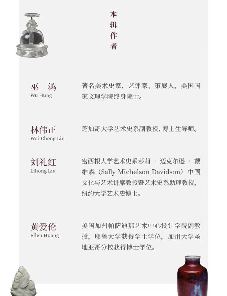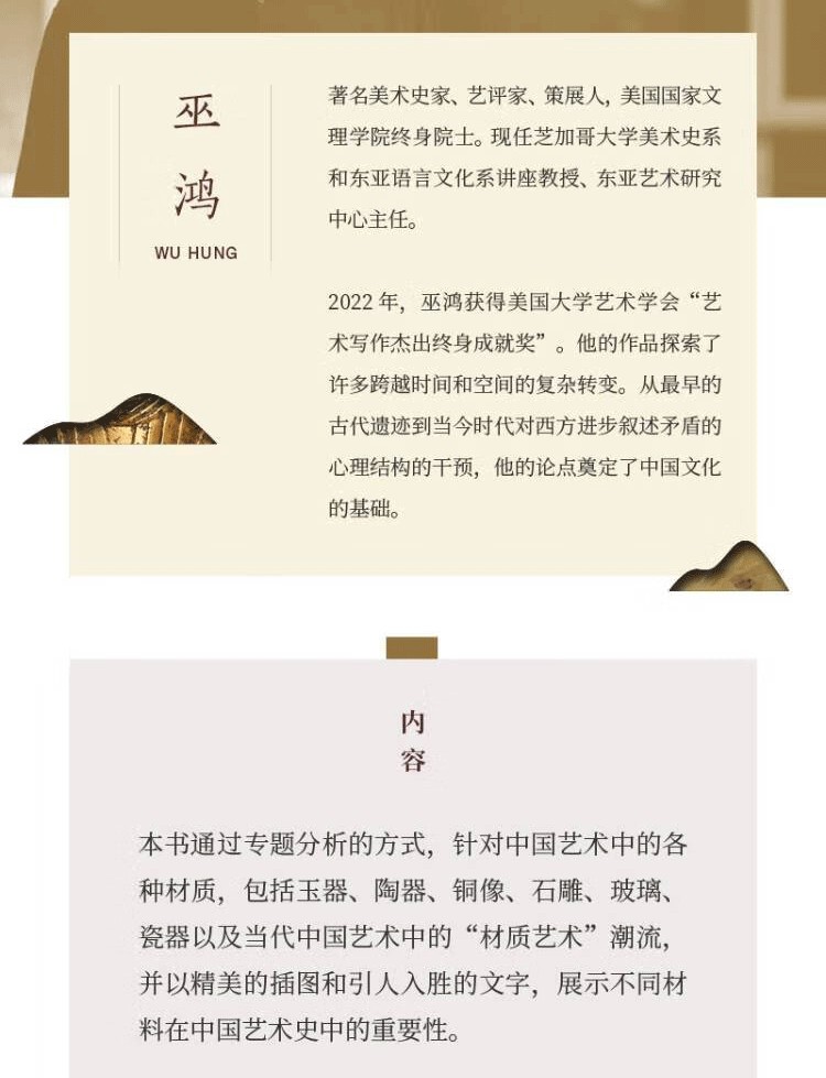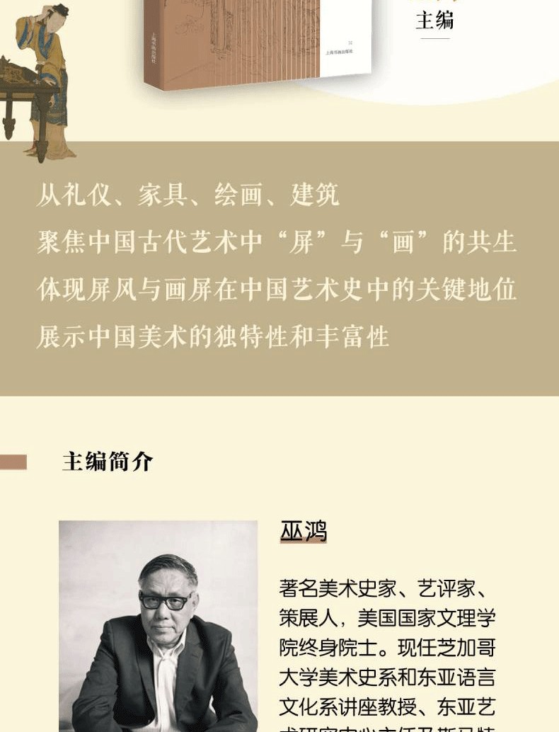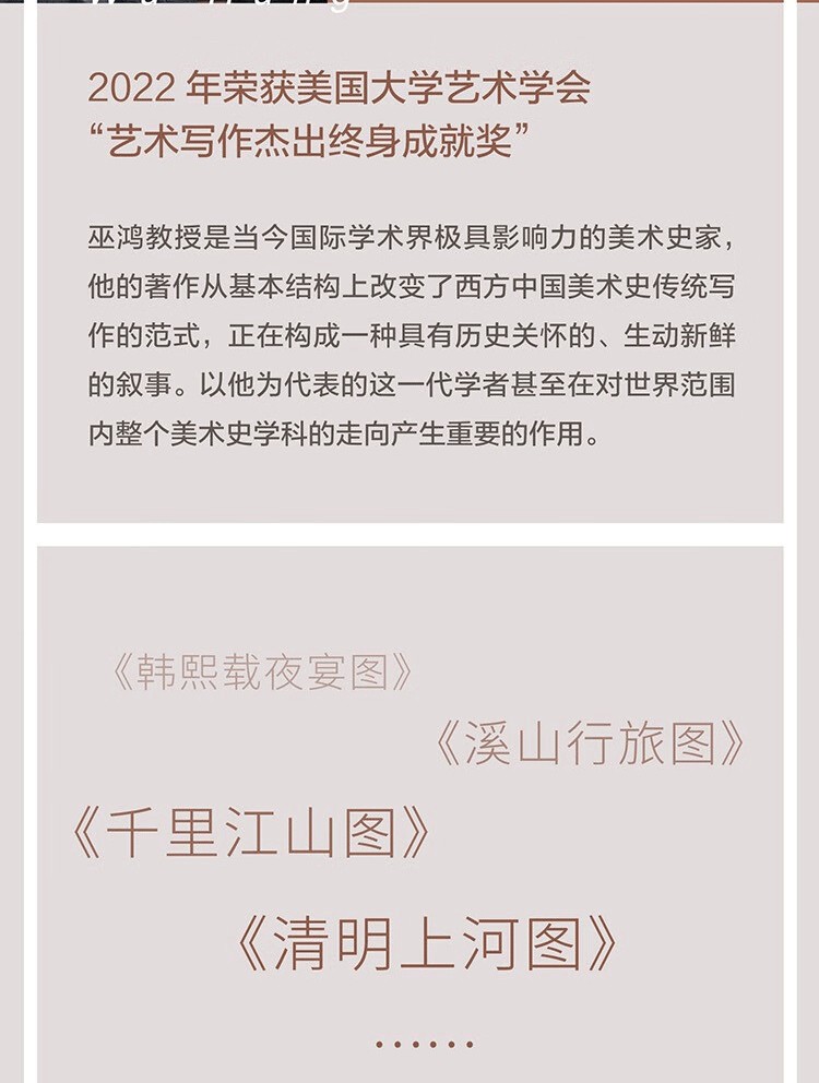 巫鴻(Wu Hung),早年任職於北京故官博物院書畫組、金石組,獲中央美術學院美術史系碩士。 1987 年獲哈佛大學美術史與人類學雙重博士學位,後在該校美術史系任教,1994年獲終身教授職。 同年受聘主持芝加哥大學亞洲藝術的教學、研究項目,執「斯德本特殊貢獻教授」講席,2002年成立東亞藝術研究中心並擔任主任。 其著作《武梁祠:中國古代畫像藝術的思想性》獲1989年全美亞洲學年會很好著作獎(李文森獎);《中國古代美術和建築中的紀念碑性》獲評1996 年傑出學術出版物, 被列為20世紀90年代最有意義的藝術學著作之一;《重屏:中國繪畫的媒介與表現》獲全美很好美術史著作提名。 參與編寫《中國繪畫......