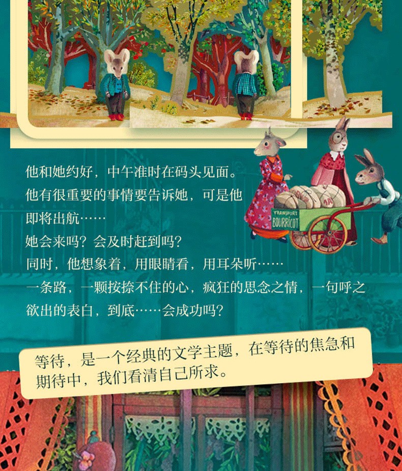 讀者幾乎可以親身「穿越」到這個約會。在精緻剪裁的書頁中,一幅幅畫作接踵而到,甘斯布等得越來越心急:讓我們沿著心愛的人踏上旅途的道路,「穿越」果園、郊區、市場、廣場……彷彿與她同行。