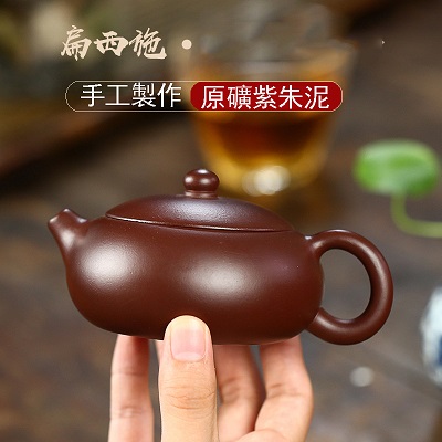 宜興丁蜀鎮原礦紫朱泥手工泥繪扁西施茶壺