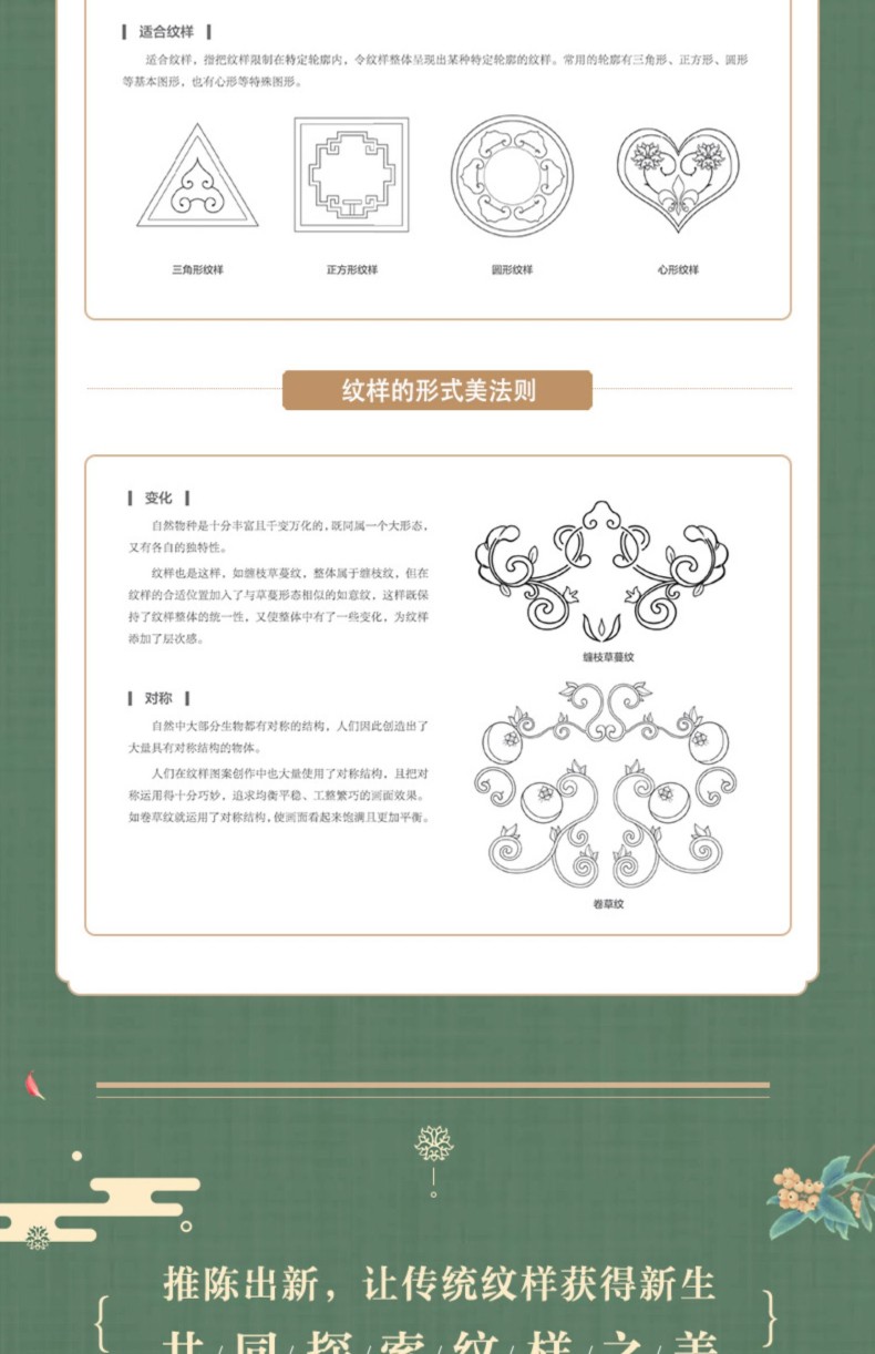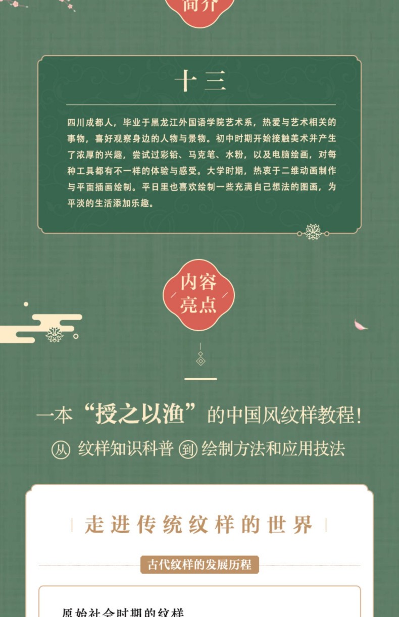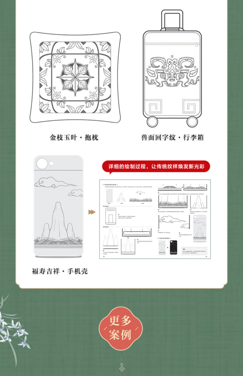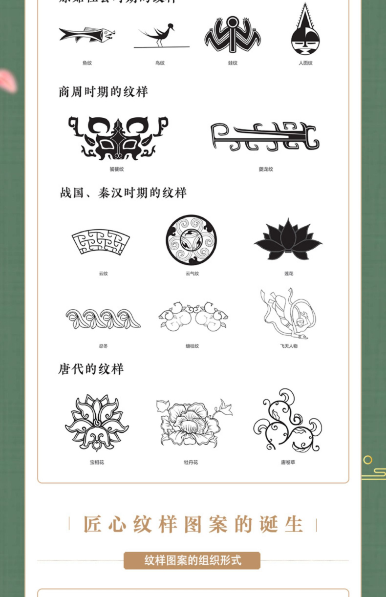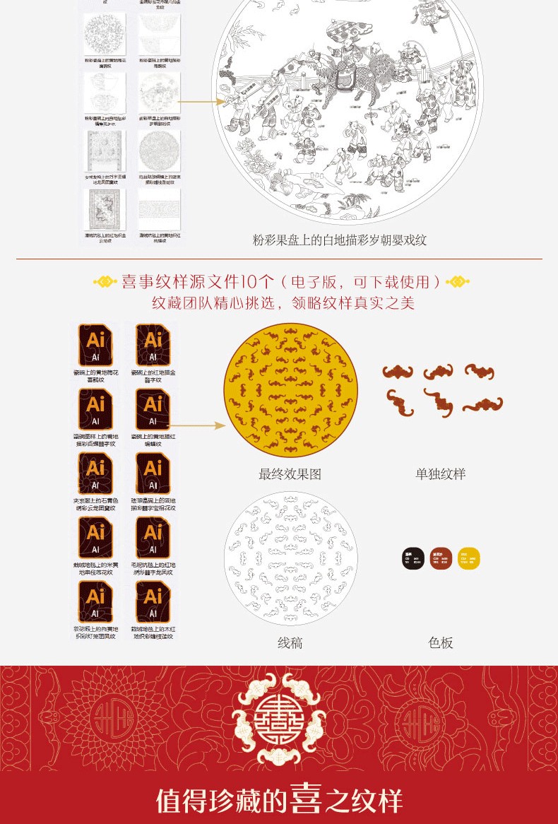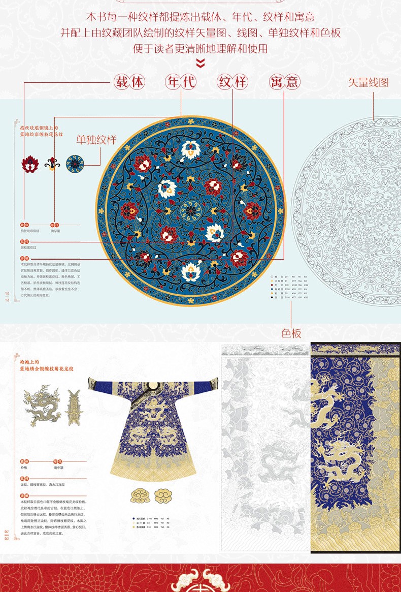 本書收錄了150組中國喜紋樣,紋樣類型眾多,包括龍鳳呈祥、喜結連理、多子多福、如意吉祥四部分內容。 涵蓋龍、鳳、獅、魚、蝶、鳥等神禽瑞獸、大自然的動物,牡丹、蓮花、梅、蘭、竹、葫蘆、瓜果等花卉植物,還有如意、八寶、暗八仙 、喜字、萬字、團壽字等諸多祥瑞紋樣。 涉及瓷器、景泰藍、漆器、織物等多種工藝載體。 本書每一種紋樣都提煉出載體、年代、紋樣和寓意,並配上由紋藏團隊繪製的紋樣向量圖、線圖、單獨紋樣和色板,便於讀者更清晰地理解和使用。 本書適合中國傳統文化愛好者、藝術從業者和設計師閱讀。