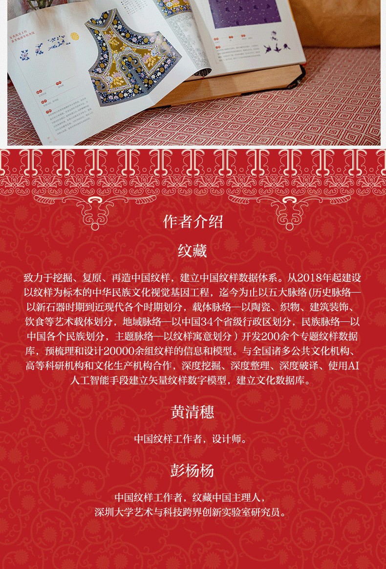紋藏致力於挖掘、復原、再造中國紋樣,建立中國紋樣資料體系。 2018年起建造以紋樣為標本的中華民族文化視覺基因工程,迄今以五大脈絡(歷史脈絡—以新石器時期到近現代各個時期劃分,載體脈絡—以陶瓷、織物、建築裝飾、飲食等藝術載體 劃分,地域脈絡—以中國34個省級行政區劃分,民族脈絡—以中國各個民族劃分,主題脈絡—以紋樣寓意劃分)開發200餘個專題紋樣數據庫,預梳理和設計20000餘組紋樣的信息和 模型。 與全國許多公共文化機構、高等科研機構和文化生產機構合作,深入挖掘、深度整理、深度破解、使用AI人工智能手段建立向量紋樣數字模型,建立文化資料庫。 黃清穗中國紋樣工作者,設計師。 彭楊楊中國紋樣工作者,紋......