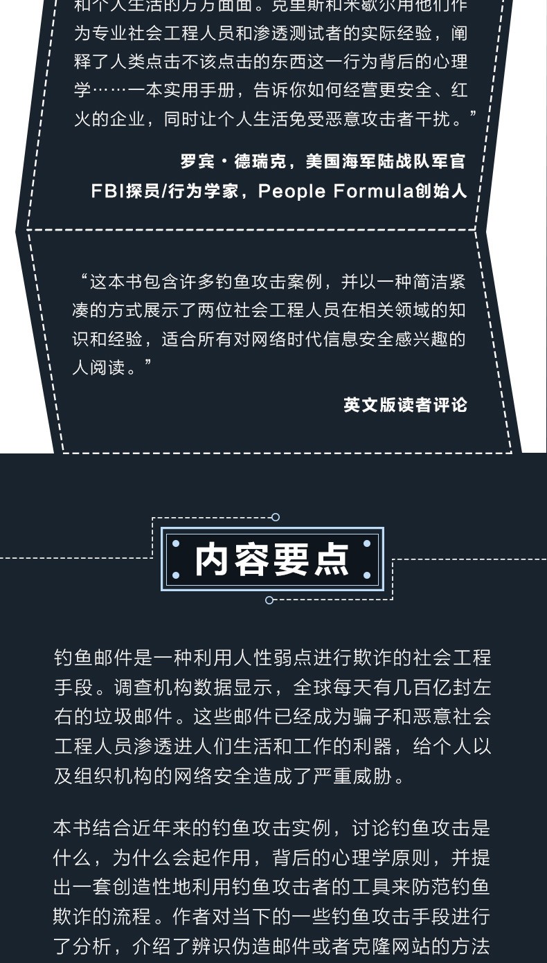 本書從專業社會工程人員的視角,詳細介紹了釣魚欺詐中所使用的心理學原則和技術工具,幫助讀者辨識和防範各種類型和難度級別的釣魚欺詐。本書包含大量真實案例,全面展示了惡意釣魚攻擊者的各種手段。本書還針對企業如何防範釣魚攻擊並組織開展相關培訓提供了切實可行的意見。