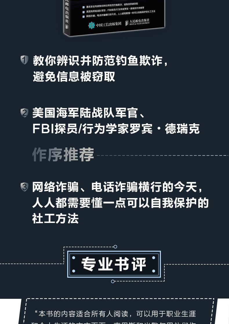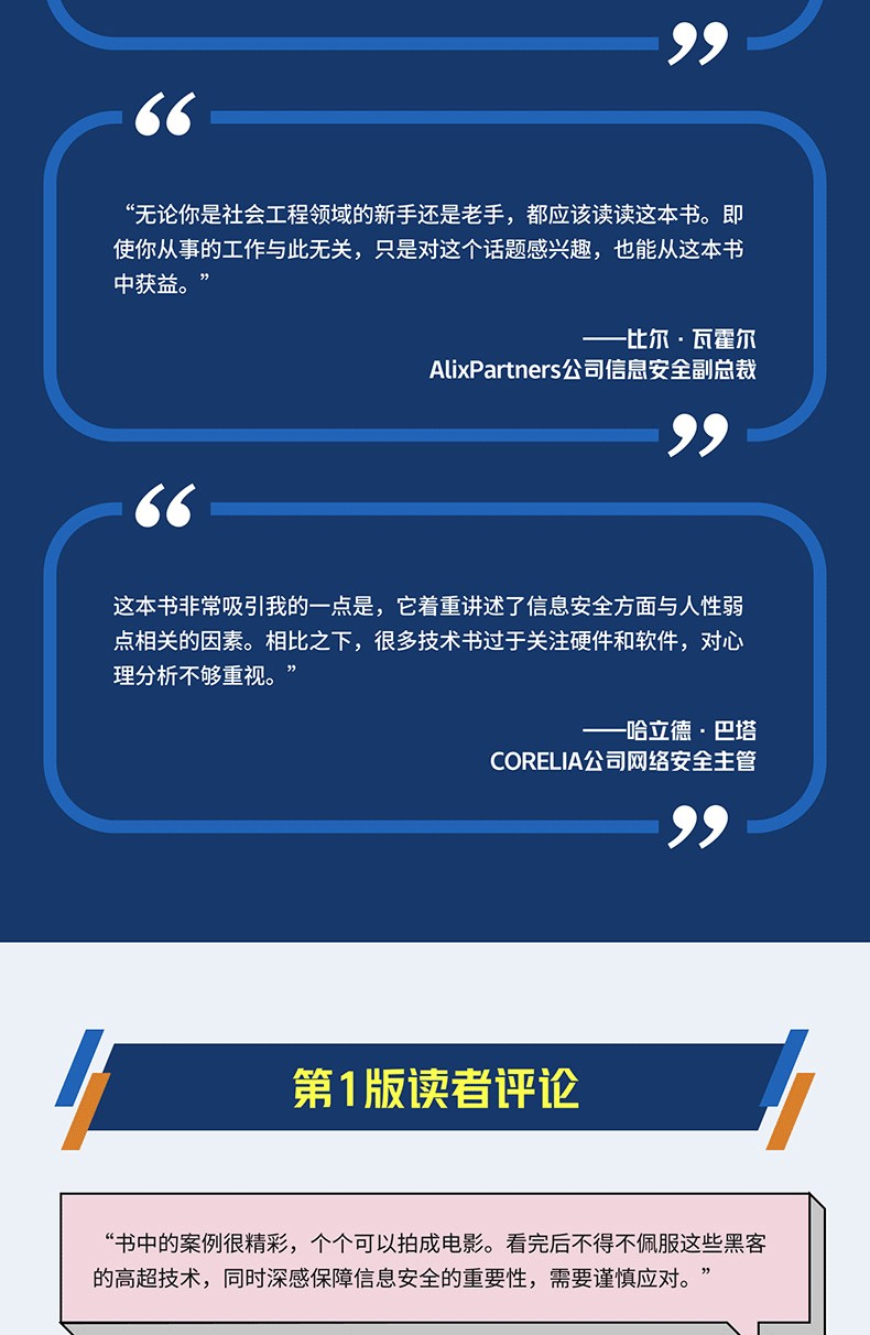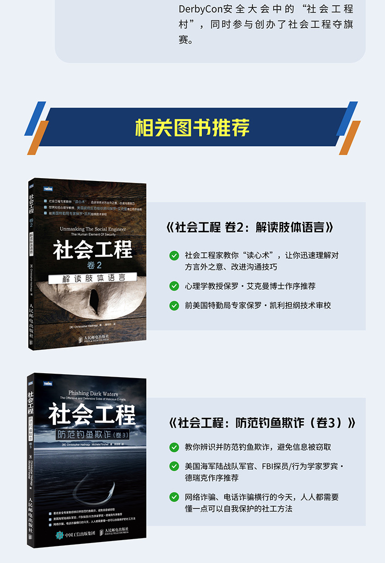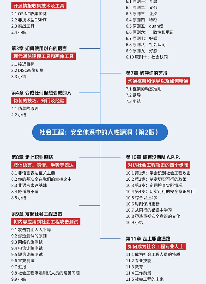 介紹社會工程實踐中的基本技能——如何了解別人真正想表達的內容,具體內容包括:非語言交流是如何運作的,手部、軀幹、腿腳等肢體語言是如何揭示情緒的,關於人類面部和大腦的研究以及案例,社會工程的核心——誘導。作者將畢生的研究以及他本人在社會工程實踐中如何使用這些知識都囊括在了本書中。
