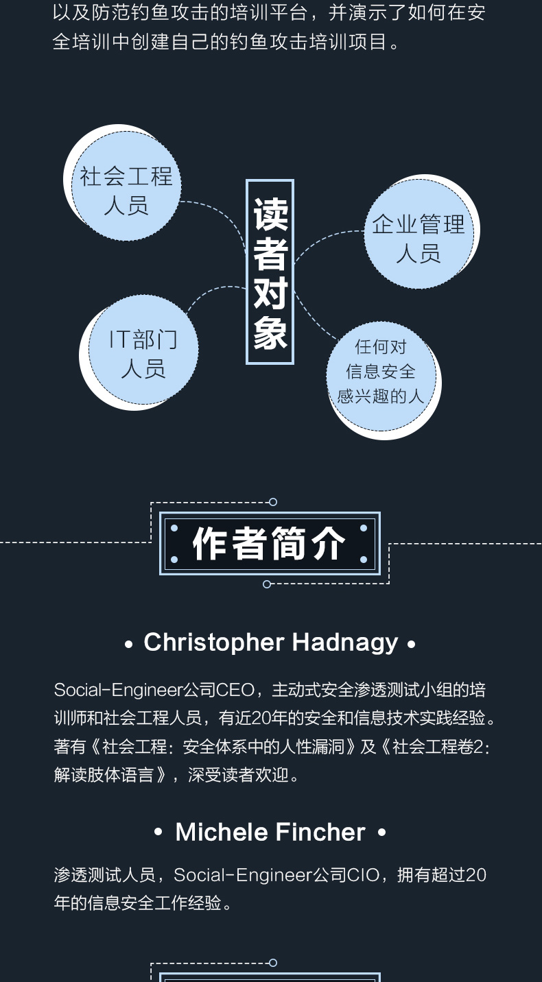 Christopher Hadnagy 杰出安全专家,Social-Engineer公司CEO,世界上头个社会工程框架的主要开 发者,主动式安全渗透测试小组的培训师和首 席社会工程专家,有近20年的安全和信息技术实践经验。著有《社会工程:安全体系中的人性漏洞》及《社会工程 卷2:解读肢体语言》,深受读者欢迎。 Michele Fincher 杰出渗透测试人员,Social-Engineer公司CIO,拥有超过20年的信息安全工作经验。