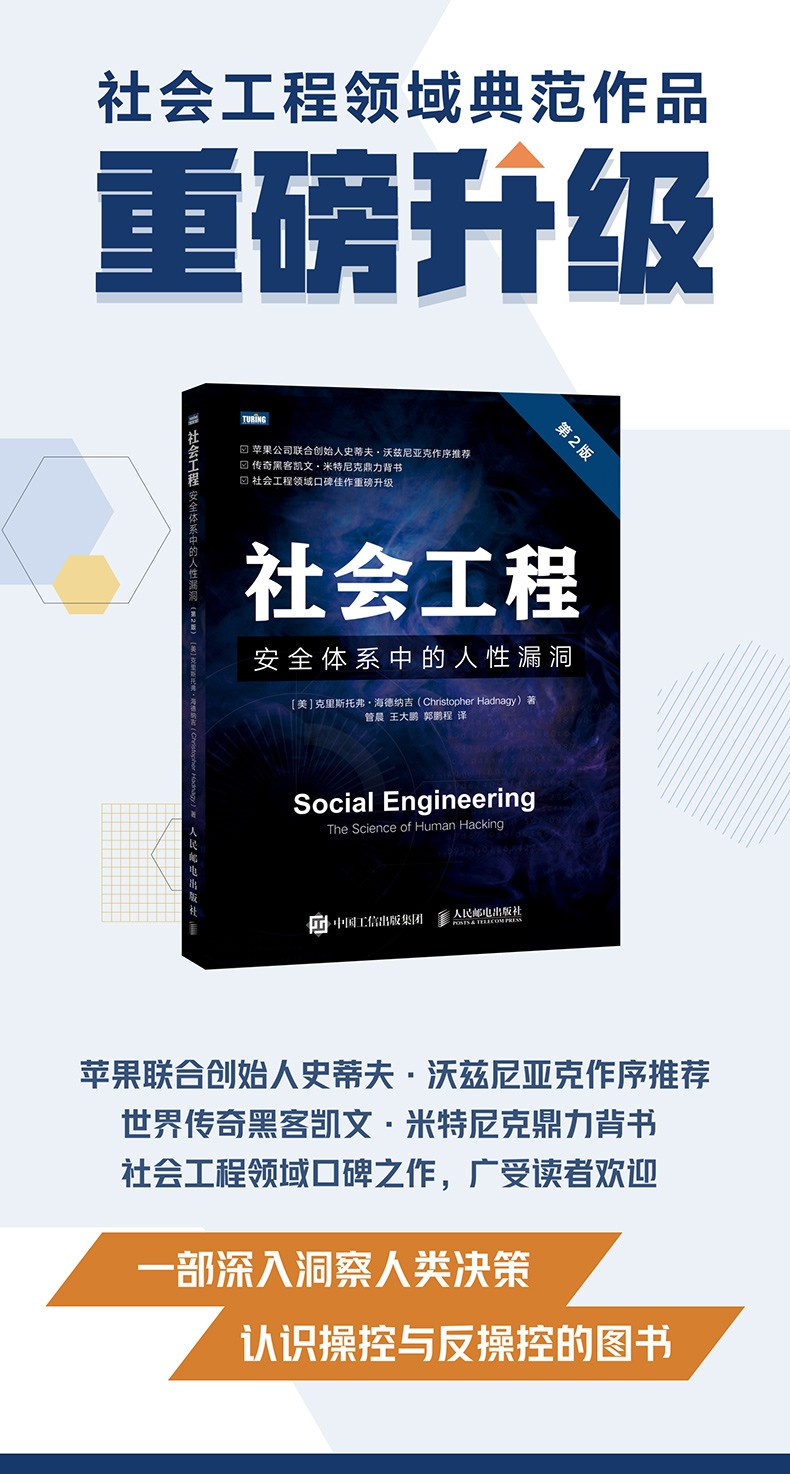 首次從技術層面剖析和解密社會工程手法,從攻擊者的視角詳細介紹了社會工程的所有方面,包括誘導、偽裝、心理影響和人際操縱等,並通過凱文·米特尼克等社會工程大師的真實故事和案例加以闡釋,探討了社會工程的奧秘。主要內容包括黑客、間諜和騙子所使用的欺騙手法,以及防止社會工程威脅的關鍵步驟。