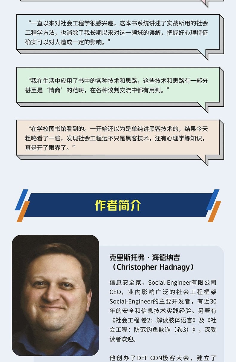 海德纳吉(Christopher Hadnagy),安全专家,社会工程框架的主要。与BackTrack安全团队一起参与了各种类型的安全项目,有近20年的安全和信息技术实践经验。他也是主动式安全(Offensive Security)渗透测试小组的培训师和社会工程专家。著有《社会工程:安全体系中的人性漏洞》,深受读者欢迎。