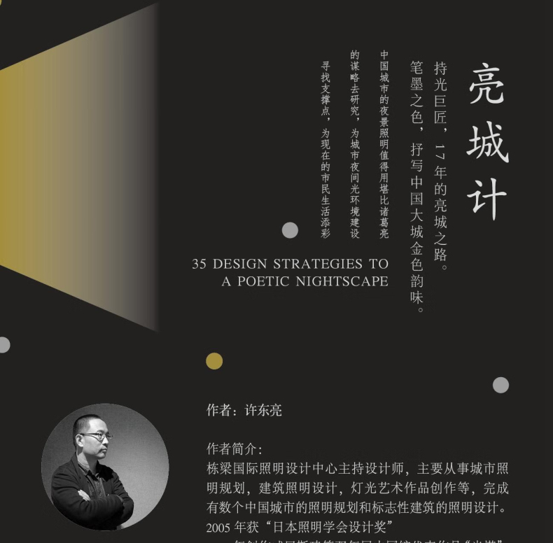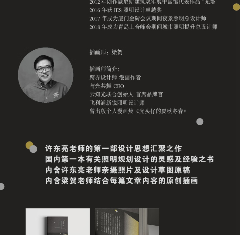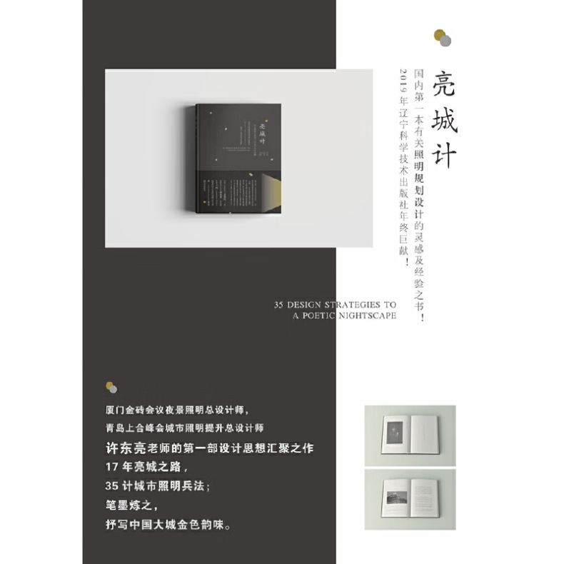 持光巨匠,17年的亮城之路。筆墨之色,,上中國大城金色韻味。本書是許東亮老師的*部設計思想匯聚之作,國內*本有關照明規劃設計的靈感及經驗之書,內含許東亮老師親攝照片及設計草圖原稿,內含梁賀老師結合每篇文章內容的原創插畫