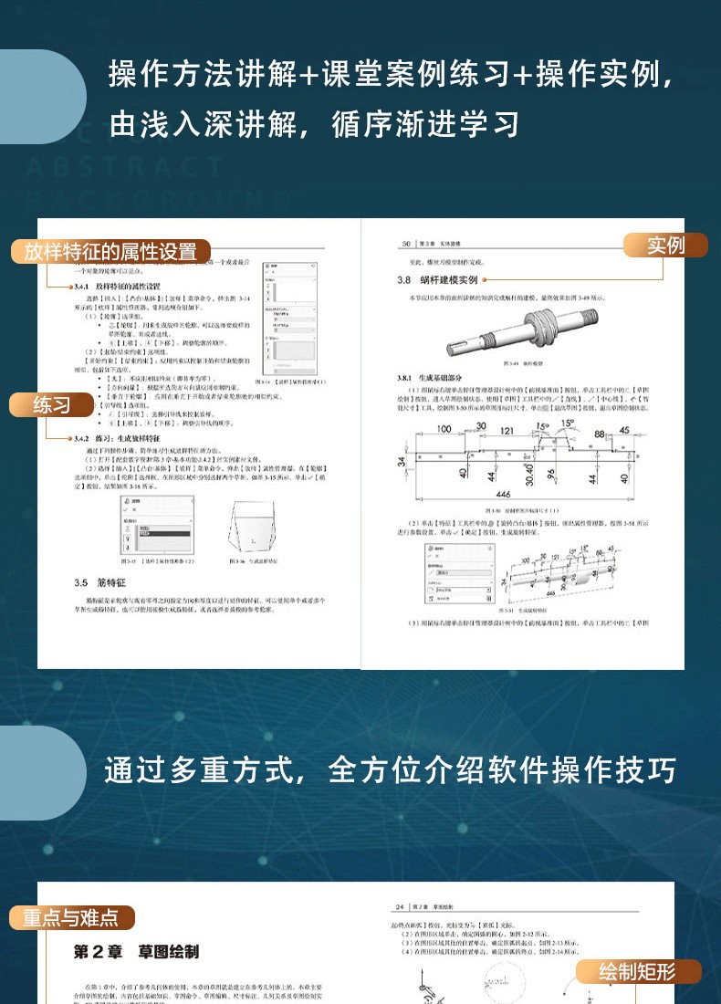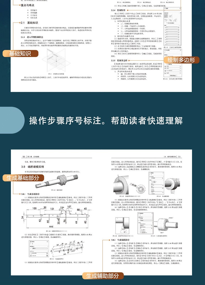 " 基礎部分:草圖相關、空間曲線、實體特徵、曲面特徵、機構動畫、有限元素等。案例包括:草圖繪製、組裝設計、工程圖、靜應力分析、機械設計、插件應用等。
