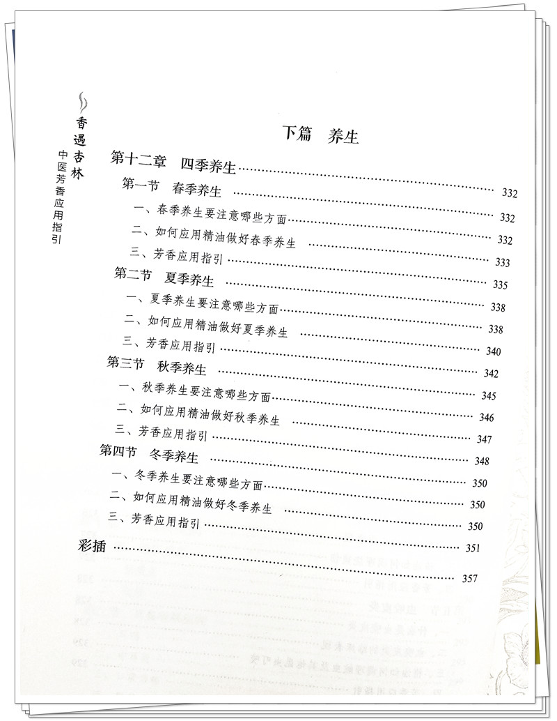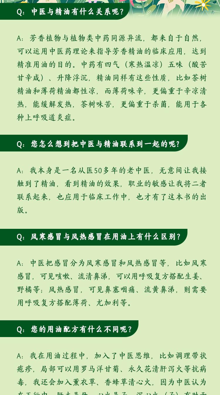 本書分上、中、下三篇,上篇基礎理論主要對植物精油的起源,精油特性,常用的單、複方精油的功效、使用方法、注意事項分別做了介紹,並對中醫陰陽、五行、藏象學說,八綱、氣血津液、臟腑辨證等中醫基礎理論做重點簡述,為學習中、下篇內容奠定基礎。中篇就內、婦、兒、骨傷、皮膚、五官等臨床各科的常見病症提出中醫辨證施油的思路與方法。下篇從中醫傳統養生視角探析四季用油思路,並為讀者提供具體的芳香應用方案。
