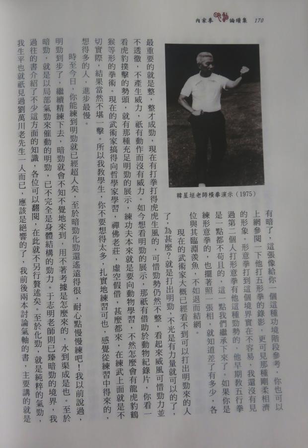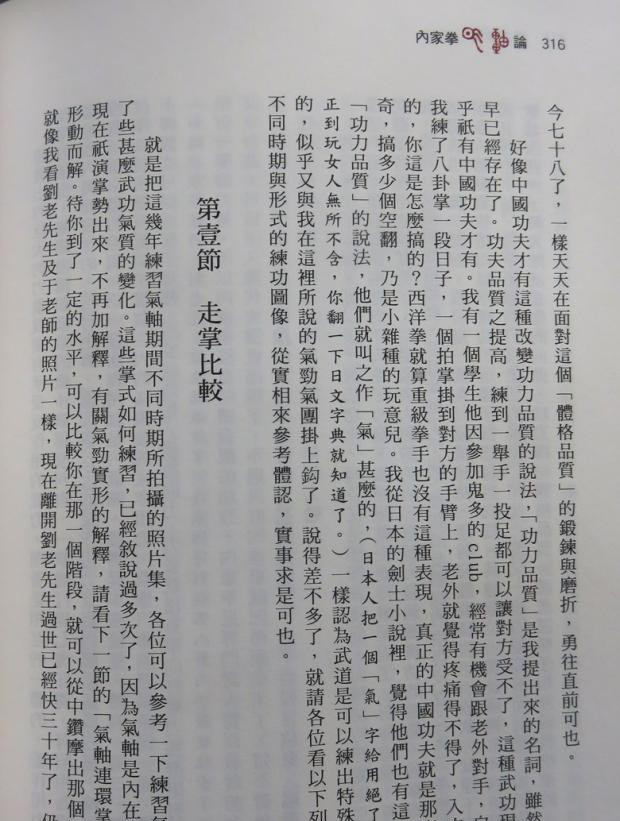 我持續練習中國武術將近七十年了,走到了今日這個氣軸階段,可以回過頭來看了,中國功夫千門百派,外家內家,不外乎是先練求得體軸,就是利用得上身體的整體力量,不煩再舉南派洪拳大師林世榮為例,你看他的中盤就是一個豐滿體軸,他的虎爪一搭上人就全身發麻,他的功夫已臻氣勁的功夫了。由體軸整勁,方才能臻氣軸的功境。不論內外家都有「內練一口氣」這一說的,練氣是我們中國武術共同的最高目標,練之可以致用,就是氣勁。我們練功夫,先練肌肉骨架的整勁,這個就是體軸的運作,再進而到內氣來推動的整氣勁,至此就沒有內外之分了。練中國武術,無論是動作或理論,並不是有如所呈現的搞得那麼複雜的,也不是一些拳理搞得那麼不可思議,很多東西都是包裝,不同包裝就是呈現出來的各種門派,外表形式如今反而成了門派的特徵,久而久之,反而把裡面的反動機給忘記掉了,大家都在形式上找尋真理。
