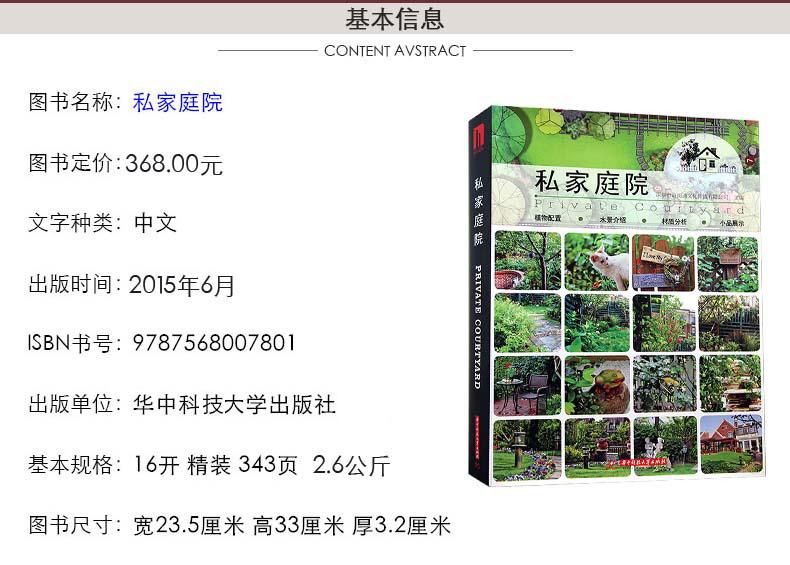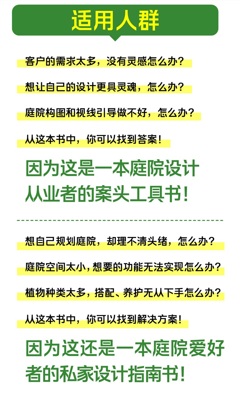 本書將全套設計流程融 匯其中,言簡意賅,清晰明 了,適合業主、園藝愛好者 、庭院設計師和大專院校的 師生閱讀參考。