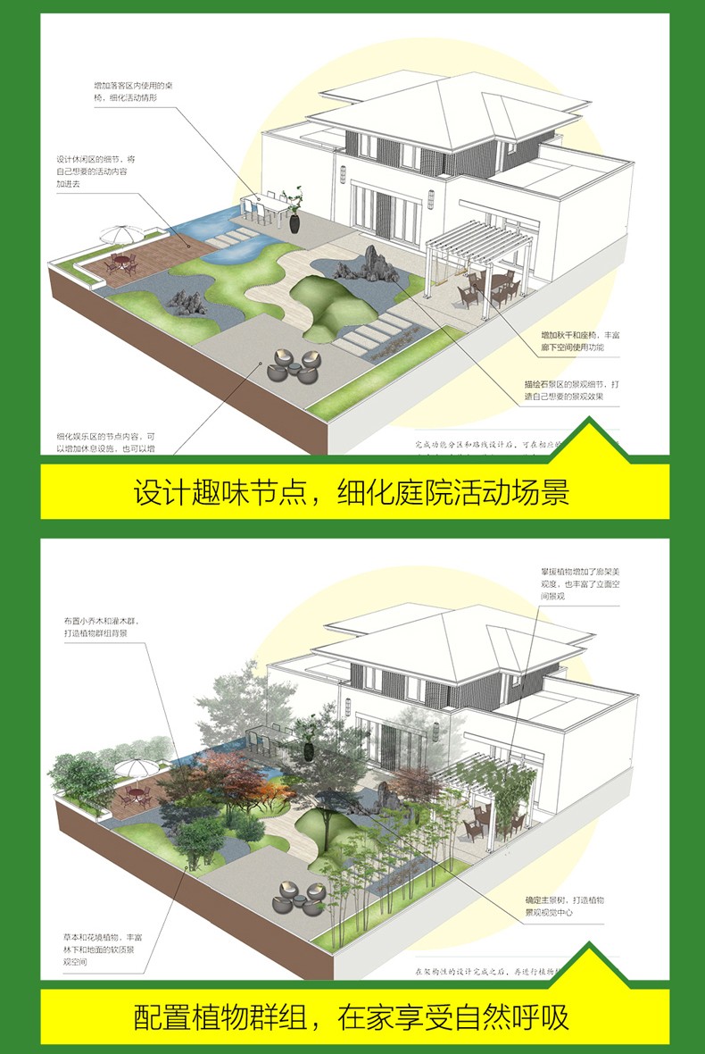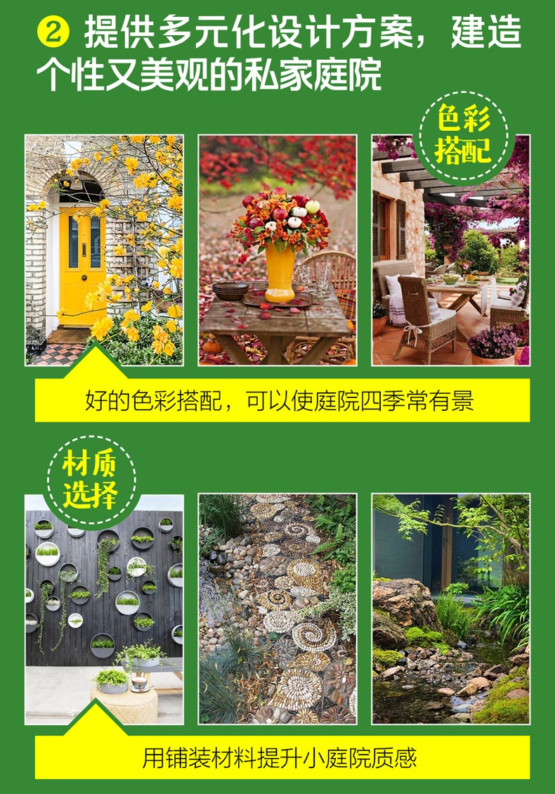 庭院造景是一門綜合的 藝術,美學沒有固有的定義 和模式,在了解庭院構景的 基礎上,對庭院整體的條件 做到心中有數,有所準備是 步。這涉及對整體空間、色彩、風格、植物、材質、小品有整體上的意向和把握,帶著自己對功能的需求,按照建造流程將圖紙落實到現實中去, 完善和增減細節部分,完成整個的設計和佈置過程。