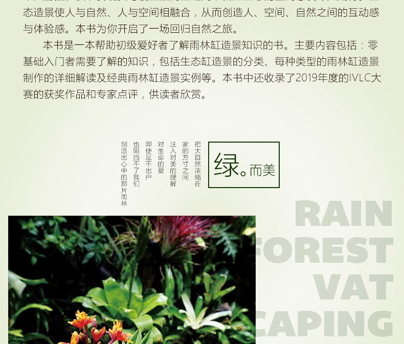 本書是在2015年8月出版的《水草造景藝術:從入門到精通》一書的升級、延伸收藏版。在內容上,在水草造景的領域之外,拓展視野,就熱帶雨林景觀整體設計做了詳細闡述和實操介紹。並加大力度介紹了當下*流行的主流熱帶雨林景觀設計的設計風格和製作過程,本書**的亮點是具有很多領域的開創性:一是**次系統闡述熱帶雨林景觀設計的設計原則和方法;二是全部圖片來自作者實地考察5個熱帶雨林的實拍圖片;三是介紹了大量的熱帶雨林景觀設計需要用到的熱門植物。全書有理論有分析,有製作過程,內容豐富多彩,是一本值得熱帶植物景觀設計愛好者收藏的精美圖書。