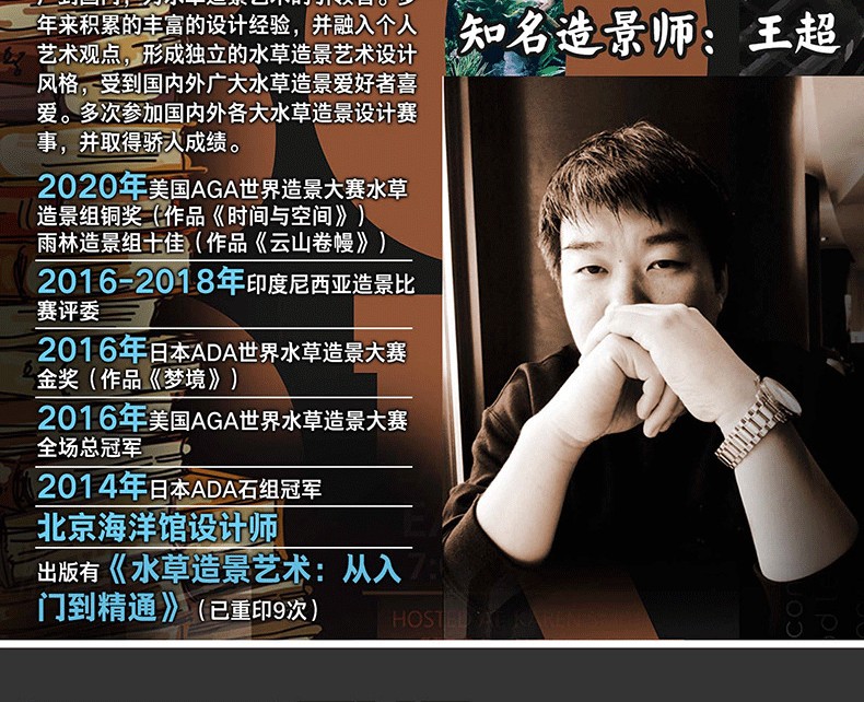 王超,生於北京,從事藝術設計工作。知名自然水草造景藝術設計師之一。多年來,致力於將自然水景藝術推廣到國內。作為水草造景藝術的引領者,多年來積累了豐富的設計經驗,並融入個人藝術觀點,形成獨立的水草造景藝術設計風格,受到國內外廣大水草造景愛好者喜愛。歷年來參加國內外備大水草造景設計賽事,並取得
