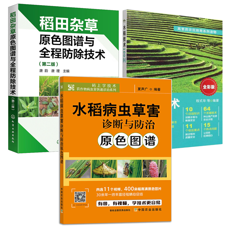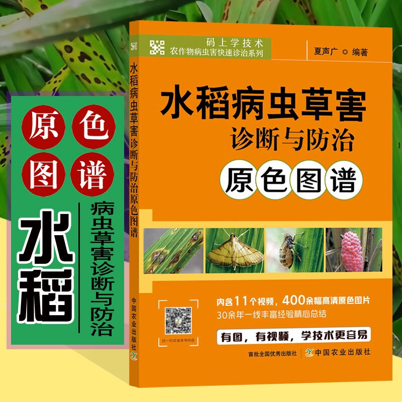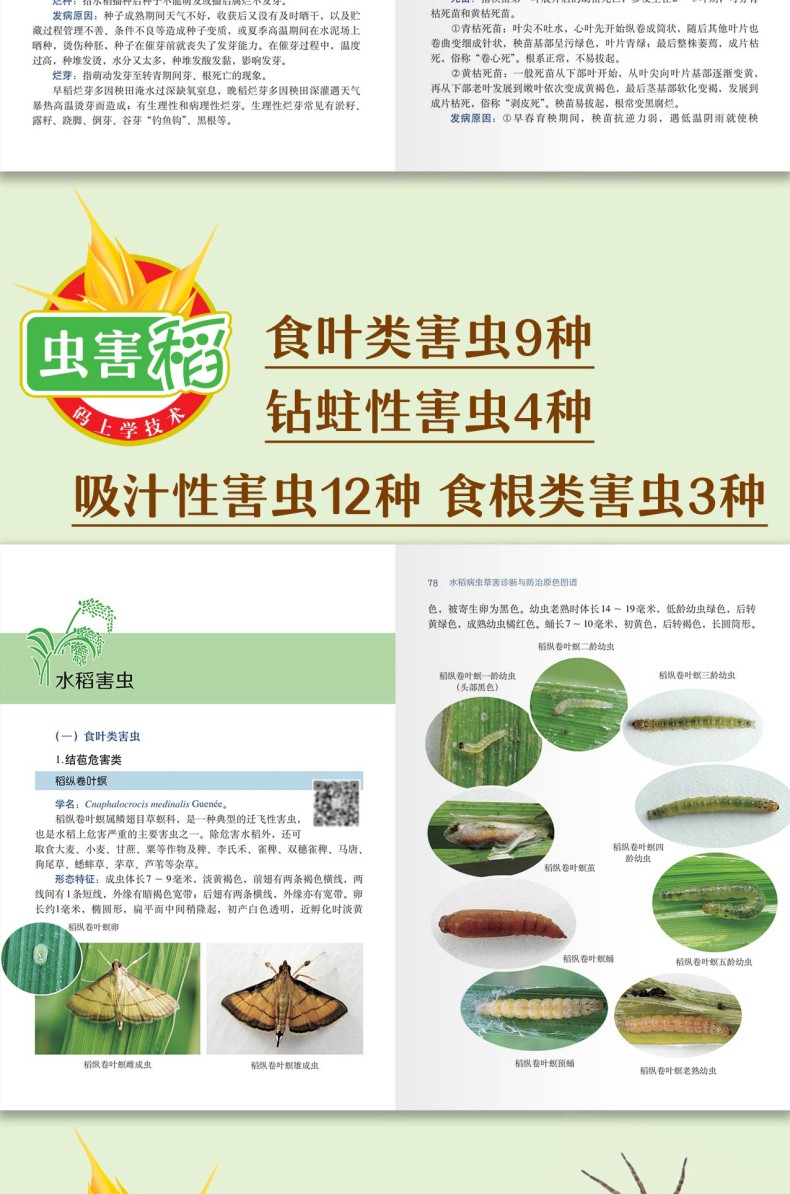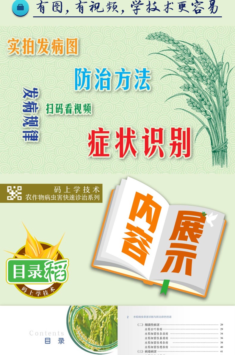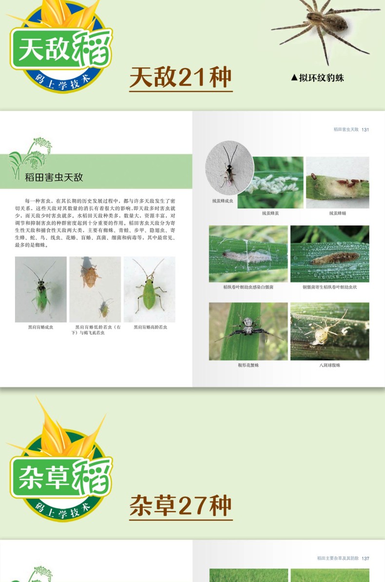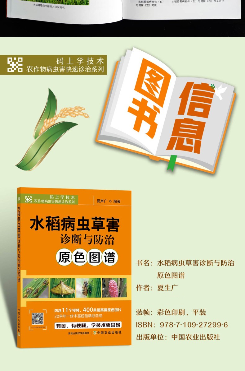 本書從水稻生產實際需要出發,總結多年來水稻病蟲草害防治實務經驗,吸取眾家精華,力求優選性、實用性和技術整合化、「傻瓜」化,是一本普及水稻病蟲草害診斷與防治的實用科普工具書。主要內容包括水稻傳染性病害(真菌、細菌、病毒、線蟲)、非傳染性病害(生理性病害、藥害、肥害)及水稻害蟲、稻田害蟲天敵、稻田主要雜草及其防除。全書共提供近百種水稻主要病蟲害及稻田主要雜草的診斷與防治技術,共展示傳染性病害27種、非傳染性病害14種、害蟲28種、天敵21種、雜草27種,共400餘幅高品質原色生態圖譜,逼真地再現了水稻害蟲不同蟲態特徵、不同時期和不同部位危害狀,病害不同時期和不同部位的症狀以及雜草和天敵的形態特徵。文字簡潔,簡單易懂,內容實用,圖片清晰,圖文並茂,形象直觀,易學、易懂、易記。