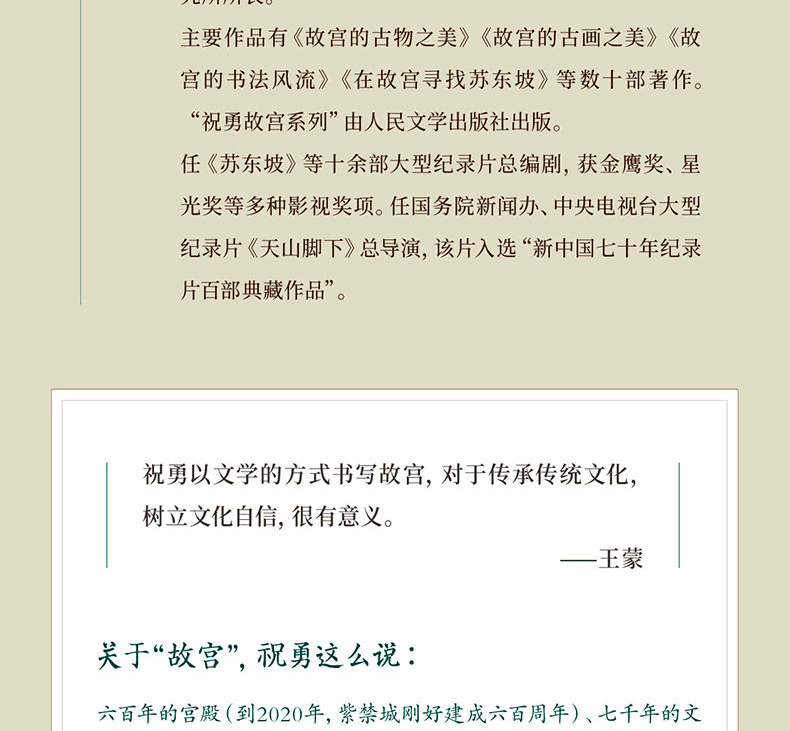 祝勇,作家、紀錄片導演,藝術學博士,祖籍菏澤,1968年出生於瀋陽,現任故宮博物院研究館員、故宮文化傳播研究所所長。主要作品有《故宮的古物之美》《故宮的古畫之美》《故宮的書法風流》《在故宮尋找蘇東坡》等數十部著作。 “祝勇故宮系列”由人民文學出版社出版。任《蘇東坡》等十餘部大型紀錄片總編劇,獲金鷹獎、星光獎等多種影視獎項。任國務院新聞辦、中央電視台大型紀錄片《天山腳下》總導演,該片入選“新中國七十年紀錄片百部典藏作品”。