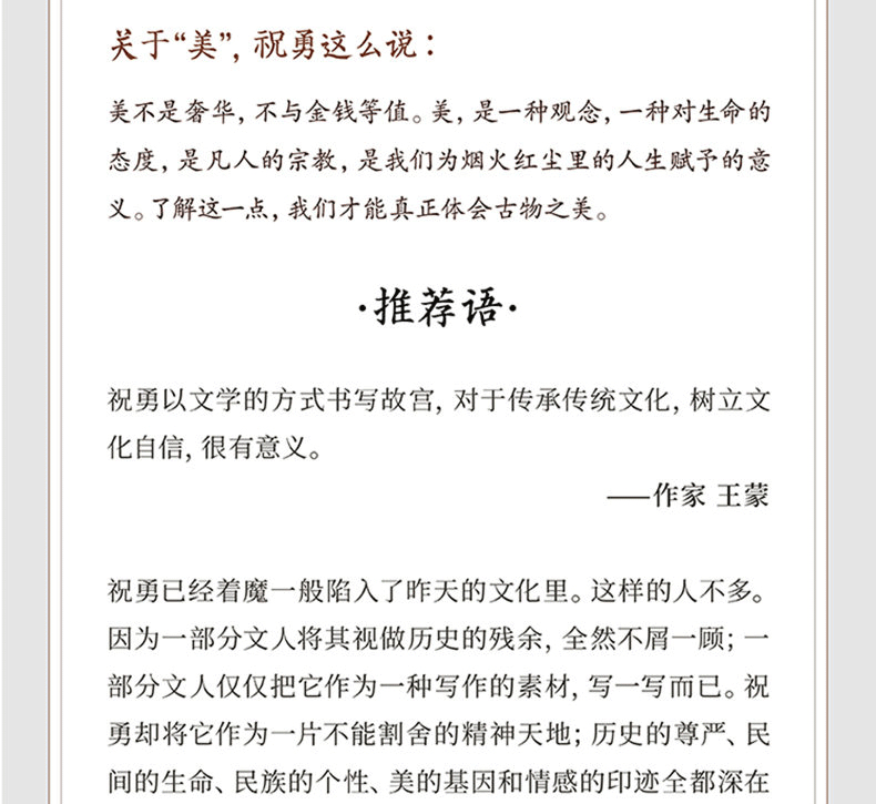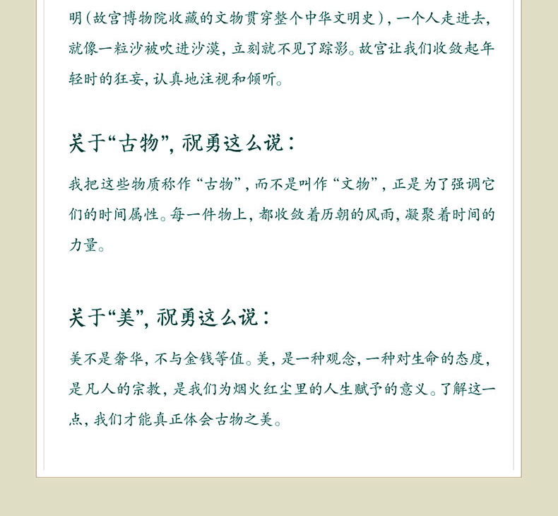《故宮的古物之美》是祝勇繼《故宮的風花雪月》《故宮的隱秘角落》《在故宮尋找蘇東坡》之後推出的又一部“故宮美文”。在這本書中,祝勇選取了18件故宮藏品,以18篇散文講述一件件國家寶藏的前世今生,連綴起一部故宮裡的藝術史,再現中華文明的營造之美。祝勇筆下的“古物”通過一個時代的物質載體,折射同時代的文化精神。這是對我們古老文明的驚訝與慨嘆,是一種由文化血統帶來的由衷自豪。