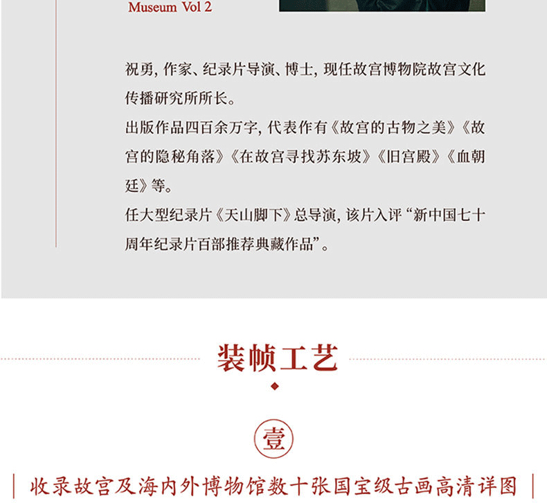 《故宮的古物之美.2》是祝勇繼《故宮的古物之美》《故宮的隱秘角落》《在故宮尋找蘇東坡》之後推出的又一部“故宮美文”。它不是一部藝術史的學術著作,而是一場精神上的尋根之旅。它或許會讓我們知道這些古代藝術品是怎樣出生,又在經歷了怎樣在的坎坷之後抵達我們的面前。面對那些久遠的墨跡,你我都會怦然心動。除了感嘆古代藝術家的驚人技法,心裡還會聯想到那些紙頁背後的故事,浮現出那些在紫禁城出現過又消失掉的人與事。請跟隨祝勇,從面前的一幅書畫開始,一步步地倒推回去,就像逆光的旅行,去尋找它們原初的形跡。全書收錄故宮及海內外博物館數十張珍稀古畫高清詳圖,內文采用純質紙四色印刷,精裝殼封採用雅絲紋紙輔之以燙金工藝,精裝外封採用萊尼紋紙輔之以高精度印刷工藝,封面背面復刻千古名畫《韓熙載夜宴圖》,做工精良,書籍本身,即是美物。