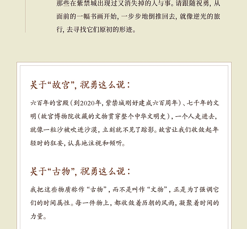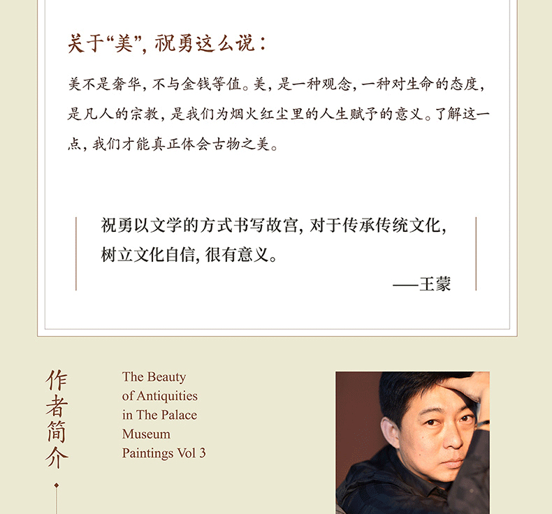 《故宮的古物之美3》是祝勇繼《故宮的古物之美》《故宮的隱秘角落》《在故宮尋找蘇東坡》之後推出的又一部“故宮美文”。它不是一部藝術史的學術著作,而是一場精神上的尋根之旅。它或許會讓我們知道這些古代藝術品是怎樣出生,又在經歷了怎樣在的坎坷之後抵達我們的面前。面對那些久遠的墨跡,你我都會怦然心動。除了感嘆古代藝術家的驚人技法,心裡還會聯想到那些紙頁背後的故事,浮現出那些在紫禁城出現過又消失掉的人與事。請跟隨祝勇,從面前的一幅書畫開始,一步步地倒推回去,就像逆光的旅行,去尋找它們原初的形跡。