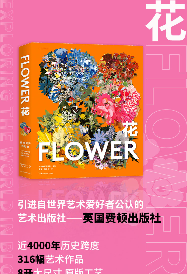《花:探索盛開的世界》帶領讀者踏上跨越各個大洲、穿越各種文化的旅程,探索從古埃及至今的約4000年間,人類歷史上藝術家和圖像製作者們對花卉圖案取之不竭的利用。這項引人入勝的調查收集了316幅華美的圖像,涵蓋了多樣的風格和媒介——從靜物畫和植物插圖到雕塑,從時裝作品到插花藝術。