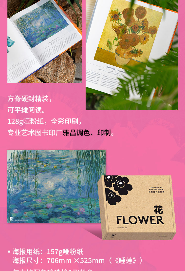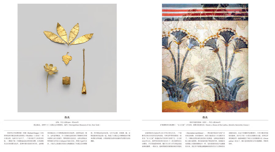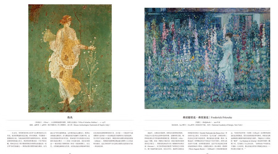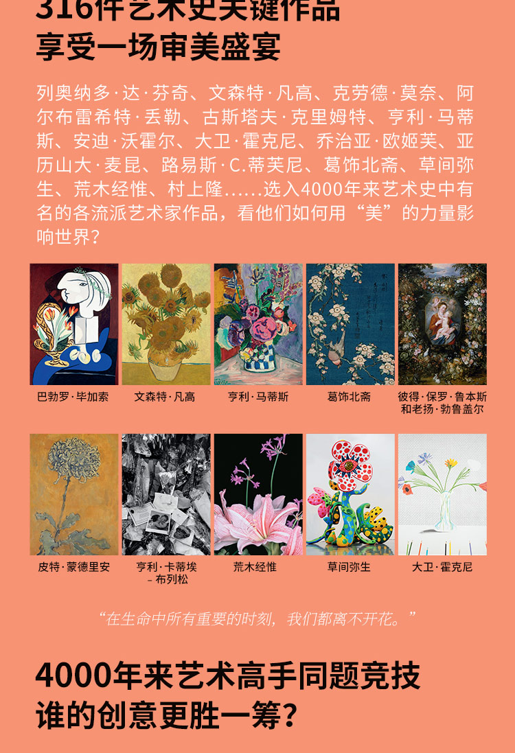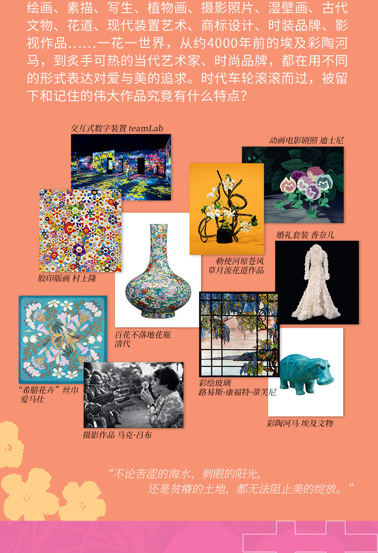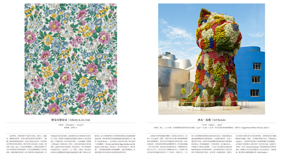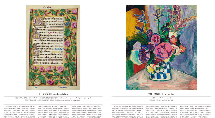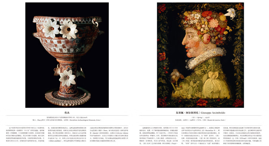 本畫冊收錄316幅花卉主題藝術作品,15萬字詳述。作品涵蓋繪畫、素描、寫生、植物插畫、攝影照片、濕壁畫、古代文物、插花作品、現代裝置、商標設計、影視劇照等多種類型,藝術家包括達文西、大衛·霍克尼、草間彌生、亨利·馬蒂斯、亞歷山大·麥昆、克勞德·莫奈、威廉·莫里斯、喬治亞·歐姬芙、皮埃爾- 約瑟夫·雷杜德等等。