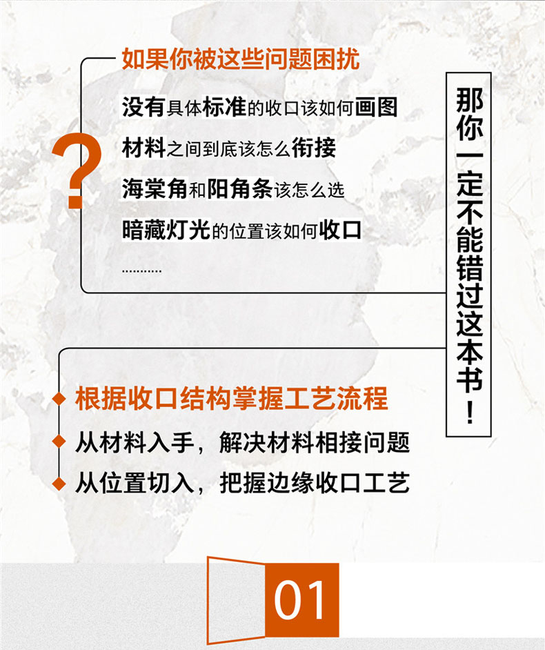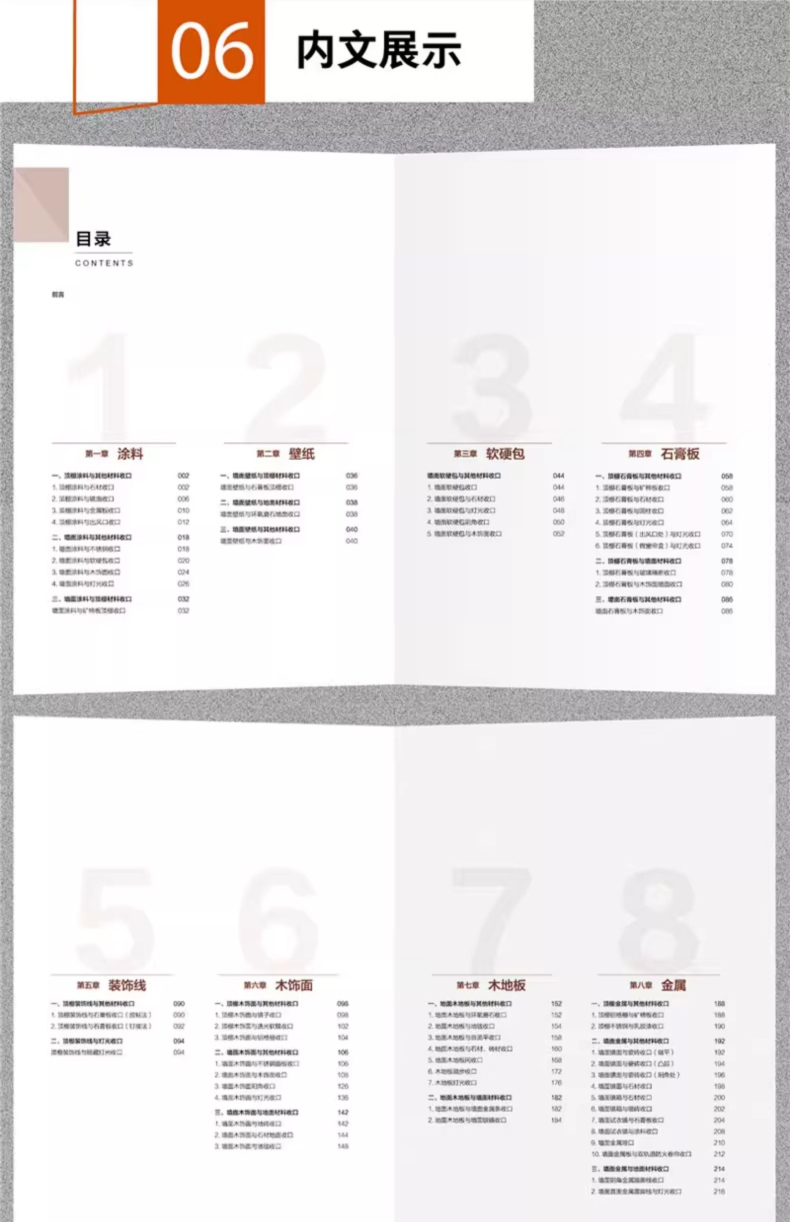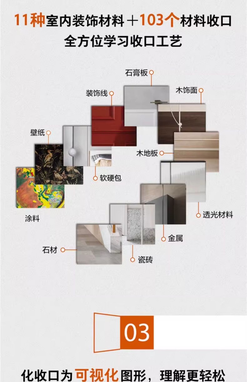 本書根據室內常見的11種裝飾材料對收口進行分類,囊括了6種收口類型,全部共103個節點,幫助讀者全方位學習收口工藝。
